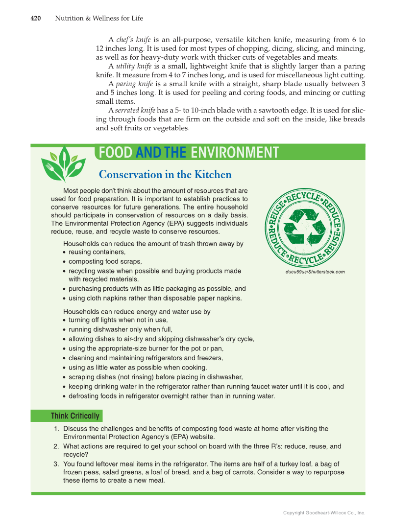 420 Nutrition & Wellness for Life Copyright Goodheart-Willcox Co., Inc. A chef’s knife is an all-purpose, versatile kitchen knife, measuring from 6 to 12 inches long. It is used for most types of chopping, dicing, slicing, and mincing, as well as for heavy-duty work with thicker cuts of vegetables and meats. A utility knife is a small, lightweight knife that is slightly larger than a paring knife. It measure from 4 to 7 inches long, and is used for miscellaneous light cutting. A paring knife is a small knife with a straight, sharp blade usually between 3 and 5 inches long. It is used for peeling and coring foods, and mincing or cutting small items. A serrated knife has a 5- to 10-inch blade with a sawtooth edge. It is used for slic- ing through foods that are firm on the outside and soft on the inside, like breads and soft fruits or vegetables. FOOD AND THE ENVIRONMENT Conservation in the Kitchen Most people don’t think about the amount of resources that are used for food preparation. It is important to establish practices to conserve resources for future generations. The entire household should participate in conservation of resources on a daily basis. The Environmental Protection Agency (EPA) suggests individuals reduce, reuse, and recycle waste to conserve resources. Households can reduce the amount of trash thrown away by • reusing containers, • composting food scraps, • recycling waste when possible and buying products made with recycled materials, • purchasing products with as little packaging as possible, and • using cloth napkins rather than disposable paper napkins. Households can reduce energy and water use by • turning off lights when not in use, • running dishwasher only when full, • allowing dishes to air-dry and skipping dishwasher’s dry cycle, • using the appropriate-size burner for the pot or pan, • cleaning and maintaining refrigerators and freezers, • using as little water as possible when cooking, • scraping dishes (not rinsing) before placing in dishwasher, • keeping drinking water in the refrigerator rather than running faucet water until it is cool, and • defrosting foods in refrigerator overnight rather than in running water. Think Critically 1. Discuss the challenges and benefits of composting food waste at home after visiting the Environmental Protection Agency's (EPA) website. 2. What actions are required to get your school on board with the three R’s: reduce, reuse, and recycle? 3. You found leftover meal items in the refrigerator. The items are half of a turkey loaf, a bag of frozen peas, salad greens, a loaf of bread, and a bag of carrots. Consider a way to repurpose these items to create a new meal. ducu59us/Shutterstock.com