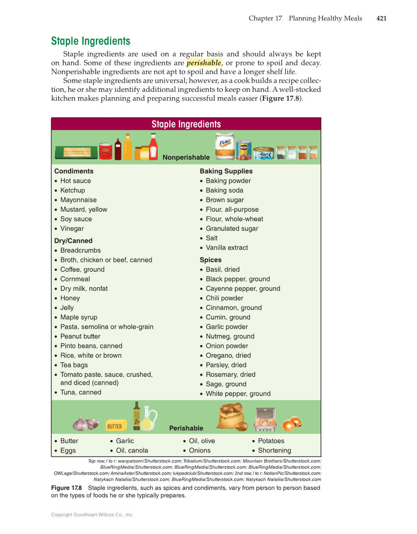 Chapter 17 Planning Healthy Meals 421 Copyright Goodheart-Willcox Co., Inc. Staple Ingredients Staple ingredients are used on a regular basis and should always be kept on hand. Some of these ingredients are perishable, or prone to spoil and decay. Nonperishable ingredients are not apt to spoil and have a longer shelf life. Some staple ingredients are universal however, as a cook builds a recipe collec- tion, he or she may identify additional ingredients to keep on hand. A well-stocked kitchen makes planning and preparing successful meals easier (Figure 17.8). Staple Ingredients Staple Ingredients Nonperishable Condiments • Hot sauce • Ketchup • Mayonnaise • Mustard, yellow • Soy sauce • Vinegar Dry/Canned • Breadcrumbs • Broth, chicken or beef, canned • Coffee, ground • Cornmeal • Dry milk, nonfat • Honey • Jelly • Maple syrup • Pasta, semolina or whole-grain • Peanut butter • Pinto beans, canned • Rice, white or brown • Tea bags • Tomato paste, sauce, crushed, and diced (canned) • Tuna, canned Baking Supplies • Baking powder • Baking soda • Brown sugar • Flour, all-purpose • Flour, whole-wheat • Granulated sugar • Salt • Vanilla extract Spices • Basil, dried • Black pepper, ground • Cayenne pepper, ground • Chili powder • Cinnamon, ground • Cumin, ground • Garlic powder • Nutmeg, ground • Onion powder • Oregano, dried • Parsley, dried • Rosemary, dried • Sage, ground • White pepper, ground Perishable • Butter • Eggs • Garlic • Oil, canola • Oil, olive • Onions • Potatoes • Shortening Top row, l to r: wanpatsorn/Shutterstock.com Tribalium/Shutterstock.com Mountain Brothers/Shutterstock.com BlueRingMedia/Shutterstock.com BlueRingMedia/Shutterstock.com BlueRingMedia/Shutterstock.com OWLage/Shutterstock.com AminaAster/Shutterstock.com lukpedclub/Shutterstock.com 2nd row, l to r: NotionPic/Shutterstock.com Natykach Nataliia/Shutterstock.com BlueRingMedia/Shutterstock.com Natykach Nataliia/Shutterstock.com Figure 17.8 Staple ingredients, such as spices and condiments, vary from person to person based on the types of foods he or she typically prepares.