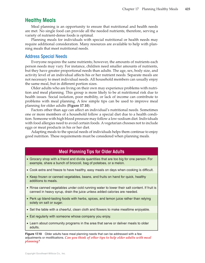 Chapter 17 Planning Healthy Meals 425 Copyright Goodheart-Willcox Co., Inc. Healthy Meals Meal planning is an opportunity to ensure that nutritional and health needs are met. No single food can provide all the needed nutrients therefore, serving a variety of nutrient-dense foods is optimal. Planning meals for individuals with special nutritional or health needs may require additional consideration. Many resources are available to help with plan- ning meals that meet nutritional needs. Address Special Needs Everyone requires the same nutrients however, the amounts of nutrients each person needs may vary. For instance, children need smaller amounts of nutrients, but they have greater proportional needs than adults. The age, sex, body size, and activity level of an individual affects his or her nutrient needs. Separate meals are not necessary to meet individual needs. All household members can usually enjoy the same meal, but in different portion sizes. Older adults who are living on their own may experience problems with nutri- tion and meal planning. This group is more likely to be at nutritional risk due to health issues. Social isolation, poor mobility, or lack of income can contribute to problems with meal planning. A few simple tips can be used to improve meal planning for older adults (Figure 17.10). Factors other than age can affect an individual’s nutritional needs. Sometimes one or more members of a household follow a special diet due to a health condi- tion. Someone with high blood pressure may follow a low-sodium diet. Individuals with food allergies need to avoid certain foods. A vegetarian chooses not to include eggs or meat products in his or her diet. Adapting meals to the special needs of individuals helps them continue to enjoy good nutrition. These requirements must be considered when planning meals. Meal Planning Tips for Older Adults Meal Planning Tips for Older Adults • Grocery shop with a friend and divide quantities that are too big for one person. For example, share a bunch of broccoli, bag of potatoes, or a melon. • Cook extra and freeze to have healthy, easy meals on days when cooking is difficult. • Keep frozen or canned vegetables, beans, and fruits on hand for quick, healthy additions to meals. • Rinse canned vegetables under cold running water to lower their salt content. If fruit is canned in heavy syrup, drain the juice unless added calories are needed. • Perk up bland-tasting foods with herbs, spices, and lemon juice rather than relying solely on salt or sugar. • Set the table with a cheerful, clean cloth and flowers to make mealtime enjoyable. • Eat regularly with someone whose company you enjoy. • Learn about community programs in the area that serve or deliver meals to older adults. Figure 17.10 Older adults have meal planning needs that can be addressed with a few adjustments or modifications. Can you think of other tips to help older adults with meal planning?