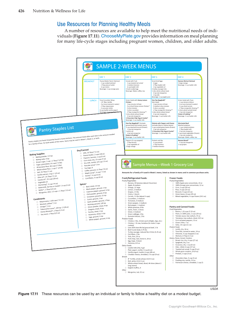 426 Nutrition & Wellness for Life Copyright Goodheart-Willcox Co., Inc. Use Resources for Planning Healthy Meals A number of resources are available to help meet the nutritional needs of indi- viduals (Figure 17.11). ChooseMyPlate.gov provides information on meal planning for many life-cycle stages including pregnant women, children, and older adults. DAY 1 DAY 2 DAY 3 DAY 4 BREAKFAST 1 cup cooked oatmeal ¼ cup raisins Beverage: 1 cup orange juice Cereal with Fruit: 1 cup toasted oat cereal 1 medium banana ¼ cup lowfat milk 1 hard-cooked egg Scrambled Eggs: 2 eggs 2 Tbsp lowfat milk 1 tsp vegetable oil 2 turkey sausage links 1 slice whole-wheat toast ½ tsp tub margarine 1 tsp jelly Beverage: 1 cup apple juice Banana Walnut Oatmeal 1 large orange Beverage: 1 cup lowfat milk LUNCH Tuna-Cucumber Wrap: 3 oz tuna (canned in water) 2 Tbsp mayonnaise ¼ cup lowfat vanilla yogurt Beverage: 1 cup lowfat milk Green Salad with Honey Lemon Chicken: 3 oz sliced Honey Lemon Chicken* 3 slices tomato 5 slices cucumber 1 slice whole-wheat bread ½ tsp tub margarine 1 Chocolate Chip Yogurt Cookie* Beverage: 1 cup lowfat milk Side Salad: 3 medium slices tomato 5 slices cucumber 1 slice whole-wheat bread ½ tsp tub margarine Beverage: 1 cup lowfat milk Green Salad with Tuna: 3 oz tuna (canned in water) ¼ cup sliced carrots 1 slices whole-wheat bread 1 tsp tub margarine Shake-A-Pudding* Beverage: 1 cup lowfat milk DINNER Honey Lemon Chicken* Brown Rice Pilaf 1 cup peas and corn: ½ cup corn (frozen) ½ cup green peas (frozen) 1 tsp tub margarine 1 Chip Cookie* Beverage: 1 cup lowfat milk (includes ground beef and tomato sauce) ½ cup steamed broccoli (frozen) ½ tsp tub margarine 1 white roll 1 tsp tub margarine Shake-A-Pudding* Beverage: 1 cup lowfat milk Polenta with Pepper and Cheese (includes black or kidney beans) 1 cup cooked green beans (frozen) 1 tsp tub margarine 1 Chocolate Chip Yogurt Cookie* Beverage: 1 cup lowfat milk Marinated Beef Mashed potatoes: 1 cup cooked potatoes 1 Tbsp lowfat milk 2 tsp tub margarine 1 cup mixed vegetables (frozen) 1 tsp tub margarine SNACKS 2 Tbsp hummus 6 whole-grain crackers Popcorn (3 cups popped) 2 Tbsp kernels 1 tsp vegetable oil 1 large orange Pretzels and Dip ½ cup pretzels 1 Tbsp hummus 1 medium banana Banana Bread* ½ tsp tub margarine 1 cup grapes SAMPLE 2-WEEK MENUS Pantry Staples List Pantry staples are foods frequently found in home kitchens. The amount listed aer each item is t hChocolate e amount n eeYogurt d ed for a family of four, for both weeks of the menu. Items may be used in Week 1, Week 2, or both. Baking Supplies □ Baking powder, 3.5 tsp □ Baking soda, 4 tsp □ Brown sugar, 1 cup + 2 Tbsp (~1/2 lb) □ Sugar, granulated, 2½ cups (~2 lbs) □ All-purpose flour, 8¼ cups (~3 lbs) □ Whole wheat flour, 1 cup (~ 1/3 lb) □ Salt, 2¼ Tbsp (~1 oz) □ Vanilla extract, 2 tsp (~ 1/3 oz) □ Olive oil*, 2⅓ Tbsp (~2 oz) □ Canola oil*, 3½ cups (28 oz) □ Vegetable oil □ Shortening*, ½ cup (~4 oz) □ Buermilk, fat-free or lowfat*, ¼ cup (2 oz) □ Buer*, 1 Tbsp (1/2 oz) □ Margarine, sck, 1.5 cups + 1 Tbsp (~13 oz) Condiments □ Mayonnaise, 1 3/8 cups (~11 oz) □ Mustard, yellow*, 5 oz □ Vinegar*, 6 oz □ Tabasco/hot sauce*, 3/8 tsp (~1/8 oz) □ Hon ey Mustard*, 2 Tbsp (1.5 oz) □ Soy sauce, 1 Tbsp (1/2 oz) Dry/Canned □ Jelly, 16 Tbsp (~11 oz) □ Peanut buer, 2 cups (18 oz) □ Popcorn, kernels, 1 cup (5 oz) □ Corn meal, dry, 1½ cups (7 oz) □ Dry milk, nonfat, 2/3 cup (~3 oz) □ Pancake syrup*, 6 oz □ Tea bags, 8 □ Coffee, ground, 11 Tbsp (~6 oz) □ Maple syrup*, ¼ cup (~ 3 oz) □ Honey*, ¼ cup (3 oz) □ Cornflakes, ½ cup (4 oz) Spices* □ Basil, dried, 1½ tsp □ Black pepper, ground, 1 tsp □ Cayenne pepper, ground, ¼ tsp □ Chili powder, ground, 4 tsp □ Cinnamon, ground, 1½ tsp □ Cumin, ground, 1 tsp □ Garlic powder, ground, 2 Tbsp □ Nutmeg, ground, 1/8 tsp □ Onion powder, dried, 4 tsp □ Oregano, dried, 4 tsp □ Parsley, dried, 1 tsp □ Rosemary, dried, ½ tsp □ Sage, ground, ½ tsp □ White pepper, ground, ¼ tsp Note: Some items used in both weeks 1 and 2 amount shown is for week 1 ONLY totally amount of non-perishables for both weeks may be purchased together. Sample Menus—Week 1 Grocery List Amounts for a Family of 4 used in Week 1 menu, listed as shown in menu and in common purchase units. Fresh/Refrigerated Foods: Fruits/Vegetables □ Banana, 20 bananas (about 4 bunches) □ Apple, 8 medium □ Orange, 12 large □ Lemon, 2 medium □ Grapes, 1.5 lbs □ Celery, 1 bunch □ Carrots, 1.5 lbs (about 5 cups) □ Cucumbers, 2 medium □ Tomatoes, 4 medium □ Green pepper, 1 medium □ Red pepper, 1 medium □ White potatoes, 8 lbs □ Garlic, fresh, 2 cloves □ Onion, 3 medium □ Green cabbage, 2 lbs □ Romaine leuce, 2 lbs Protein Foods □ Chicken, 4 lbs, chicken parts (thighs, legs, etc.) □ Chicken, 1 lb raw, boneless (to make 2 cups cooked) □ Lean (92% lean 8% fat) ground beef, 1 lb □ Beef round steak, 0.75 lbs □ Turkey sausage, reduced fat, 8 links (5.25 oz) □ Fish fillets, 2 lbs □ Tofu, firm, 20 oz □ Pork chop, lean, bone-in, 20 oz □ Egg, large, 3 dozen □ Hummus, 8.5 oz Dairy Foods □ Lowfat milk (1%), 5 gal □ Plain yogurt, nonfat, ¾ cup (6 oz) □ Vanilla yogurt, lowfat, 6 cups (48 oz) □ Cheddar cheese, shredded, 2 ¼ cups (9 oz) Breads □ 8" Torlla, whole wheat, 8 (14.5 oz) □ Roll, white, 8 (12.5 oz) □ Whole wheat bread, sliced, 44 slices (about 2 long loaves) □ English muffins, 4 Other □ Margarine, tub, 9.5 oz Frozen Foods: Fruits/Vegetables □ 100% Apple juice concentrate, 24 oz □ 100% Orange juice concentrate, 12 oz □ Corn, 2 cups (10 oz) □ Peas, 4 cups (19 oz) □ Broccoli, 4 cups (22 oz) □ Green beans, 8 cups (35 oz) □ Mixed vegetables, 4 cups frozen (19.5 oz) Pantry and Canned Foods: Fruit/Vegetables □ Raisins, 1.25 cups (7.25 oz) □ Pears, in 100% juice, 2 cups (29 oz) □ Tomato sauce, low-sodium, 15 oz □ Tom