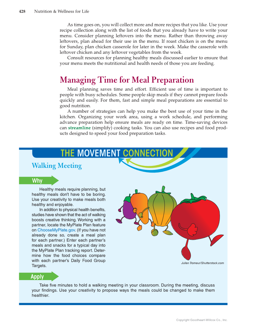 428 Nutrition & Wellness for Life Copyright Goodheart-Willcox Co., Inc. As time goes on, you will collect more and more recipes that you like. Use your recipe collection along with the list of foods that you already have to write your menu. Consider planning leftovers into the menu. Rather than throwing away leftovers, plan ahead for their use in the menu. If roast chicken is on the menu for Sunday, plan chicken casserole for later in the week. Make the casserole with leftover chicken and any leftover vegetables from the week. Consult resources for planning healthy meals discussed earlier to ensure that your menu meets the nutritional and health needs of those you are feeding. Managing Time for Meal Preparation Meal planning saves time and effort. Efficient use of time is important to people with busy schedules. Some people skip meals if they cannot prepare foods quickly and easily. For them, fast and simple meal preparations are essential to good nutrition. A number of strategies can help you make the best use of your time in the kitchen. Organizing your work area, using a work schedule, and performing advance preparation help ensure meals are ready on time. Time-saving devices can streamline (simplify) cooking tasks. You can also use recipes and food prod- ucts designed to speed your food preparation tasks. THE MOVEMENT CONNECTION Walking Meeting Why Healthy meals require planning, but healthy meals don’t have to be boring. Use your creativity to make meals both healthy and enjoyable. In addition to physical health benefits, studies have shown that the act of walking boosts creative thinking. Working with a partner, locate the MyPlate Plan feature on ChooseMyPlate.gov. (If you have not already done so, create a meal plan for each partner.) Enter each partner’s meals and snacks for a typical day into the MyPlate Plan tracking report. Deter- mine how the food choices compare with each partner’s Daily Food Group Targets. Apply Take five minutes to hold a walking meeting in your classroom. During the meeting, discuss your findings. Use your creativity to propose ways the meals could be changed to make them healthier. Julien Tromeur/Shutterstock.com
