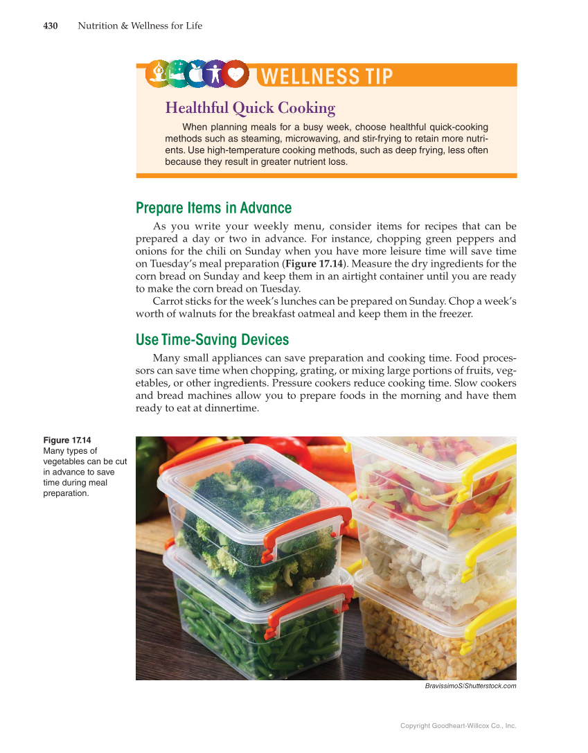 430 Nutrition & Wellness for Life Copyright Goodheart-Willcox Co., Inc. Prepare Items in Advance As you write your weekly menu, consider items for recipes that can be prepared a day or two in advance. For instance, chopping green peppers and onions for the chili on Sunday when you have more leisure time will save time on Tuesday’s meal preparation (Figure 17.14). Measure the dry ingredients for the corn bread on Sunday and keep them in an airtight container until you are ready to make the corn bread on Tuesday. Carrot sticks for the week’s lunches can be prepared on Sunday. Chop a week’s worth of walnuts for the breakfast oatmeal and keep them in the freezer. Use Time-Saving Devices Many small appliances can save preparation and cooking time. Food proces- sors can save time when chopping, grating, or mixing large portions of fruits, veg- etables, or other ingredients. Pressure cookers reduce cooking time. Slow cookers and bread machines allow you to prepare foods in the morning and have them ready to eat at dinnertime. WELLNESS TIP Healthful Quick Cooking When planning meals for a busy week, choose healthful quick-cooking methods such as steaming, microwaving, and stir-frying to retain more nutri- ents. Use high-temperature cooking methods, such as deep frying, less often because they result in greater nutrient loss. Figure 17.14 Many types of vegetables can be cut in advance to save time during meal preparation. BravissimoS/Shutterstock.com