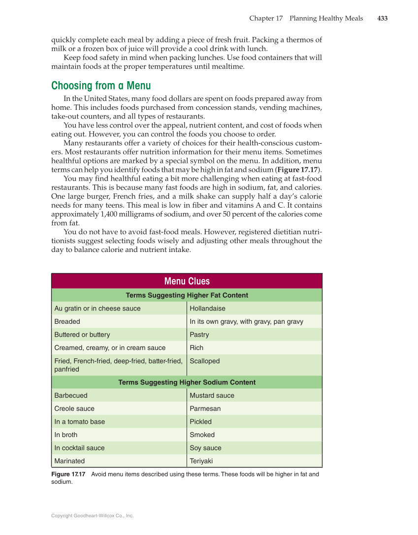 Chapter 17 Planning Healthy Meals 433 Copyright Goodheart-Willcox Co., Inc. quickly complete each meal by adding a piece of fresh fruit. Packing a thermos of milk or a frozen box of juice will provide a cool drink with lunch. Keep food safety in mind when packing lunches. Use food containers that will maintain foods at the proper temperatures until mealtime. Choosing from a Menu In the United States, many food dollars are spent on foods prepared away from home. This includes foods purchased from concession stands, vending machines, take-out counters, and all types of restaurants. You have less control over the appeal, nutrient content, and cost of foods when eating out. However, you can control the foods you choose to order. Many restaurants offer a variety of choices for their health-conscious custom- ers. Most restaurants offer nutrition information for their menu items. Sometimes healthful options are marked by a special symbol on the menu. In addition, menu terms can help you identify foods that may be high in fat and sodium (Figure 17.17). You may find healthful eating a bit more challenging when eating at fast-food restaurants. This is because many fast foods are high in sodium, fat, and calories. One large burger, French fries, and a milk shake can supply half a day’s calorie needs for many teens. This meal is low in fiber and vitamins A and C. It contains approximately 1,400 milligrams of sodium, and over 50 percent of the calories come from fat. You do not have to avoid fast-food meals. However, registered dietitian nutri- tionists suggest selecting foods wisely and adjusting other meals throughout the day to balance calorie and nutrient intake. Menu Clues Menu Clues Terms Suggesting Higher Fat Content Au gratin or in cheese sauce Hollandaise Breaded In its own gravy, with gravy, pan gravy Buttered or buttery Pastry Creamed, creamy, or in cream sauce Rich Fried, French-fried, deep-fried, batter-fried, panfried Scalloped Terms Suggesting Higher Sodium Content Barbecued Mustard sauce Creole sauce Parmesan In a tomato base Pickled In broth Smoked In cocktail sauce Soy sauce Marinated Teriyaki Figure 17.17 Avoid menu items described using these terms. These foods will be higher in fat and sodium.