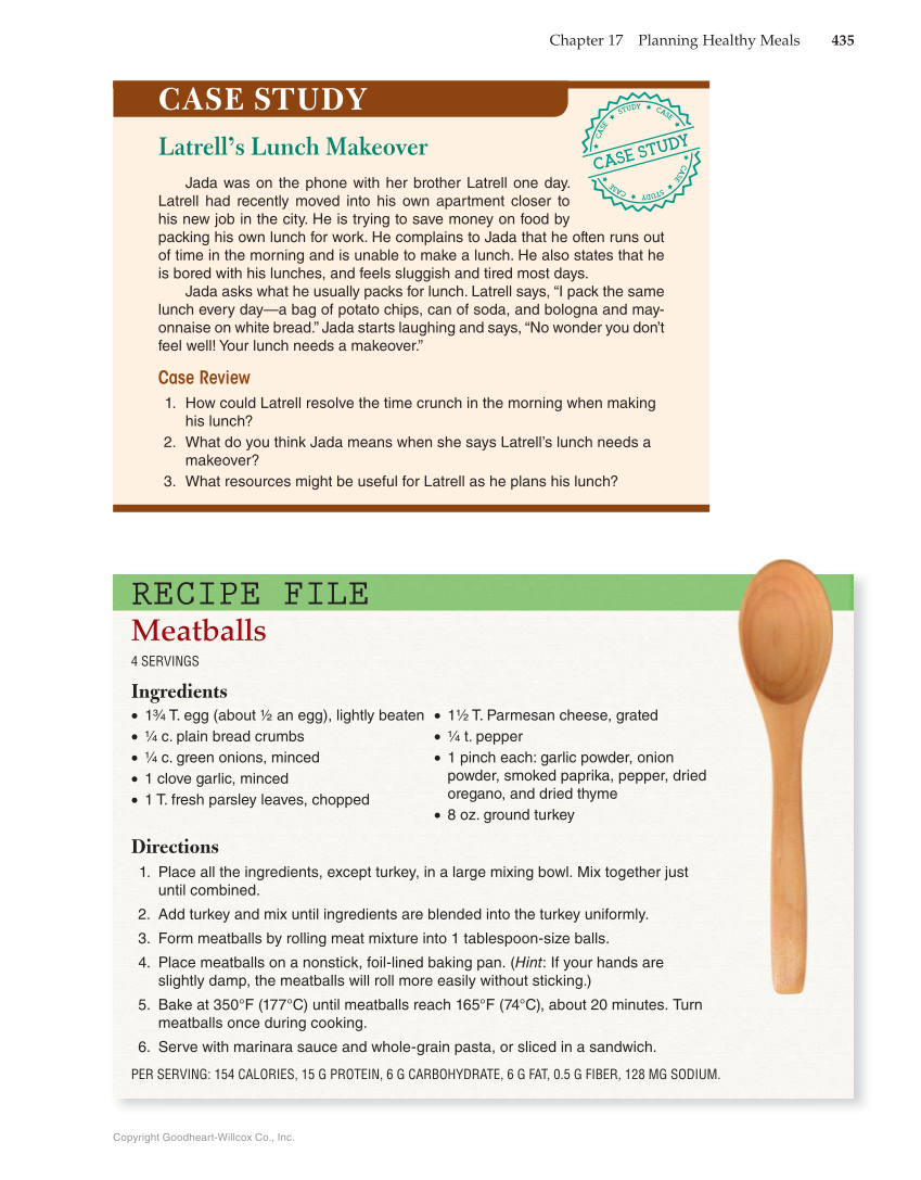 Chapter 17 Planning Healthy Meals 435 Copyright Goodheart-Willcox Co., Inc. RECIPE FILE Meatballs 4 SERVINGS Ingredients • 1¾ T. egg (about ½ an egg), lightly beaten • ¼ c. plain bread crumbs • ¼ c. green onions, minced • 1 clove garlic, minced • 1 T. fresh parsley leaves, chopped • 1½ T. Parmesan cheese, grated • ¼ t. pepper • 1 pinch each: garlic powder, onion powder, smoked paprika, pepper, dried oregano, and dried thyme • 8 oz. ground turkey Directions 1. Place all the ingredients, except turkey, in a large mixing bowl. Mix together just until combined. 2. Add turkey and mix until ingredients are blended into the turkey uniformly. 3. Form meatballs by rolling meat mixture into 1 tablespoon-size balls. 4. Place meatballs on a nonstick, foil-lined baking pan. (Hint: If your hands are slightly damp, the meatballs will roll more easily without sticking.) 5. Bake at 350°F (177°C) until meatballs reach 165°F (74°C), about 20 minutes. Turn meatballs once during cooking. 6. Serve with marinara sauce and whole-grain pasta, or sliced in a sandwich. PER SERVING: 154 CALORIES, 15 G PROTEIN, 6 G CARBOHYDRATE, 6 G FAT, 0.5 G FIBER, 128 MG SODIUM. CASE STUDY Latrell’s Lunch Makeover Jada was on the phone with her brother Latrell one day. Latrell had recently moved into his own apartment closer to his new job in the city. He is trying to save money on food by packing his own lunch for work. He complains to Jada that he often runs out of time in the morning and is unable to make a lunch. He also states that he is bored with his lunches, and feels sluggish and tired most days. Jada asks what he usually packs for lunch. Latrell says, “I pack the same lunch every day—a bag of potato chips, can of soda, and bologna and may- onnaise on white bread.” Jada starts laughing and says, “No wonder you don’t feel well! Your lunch needs a makeover.” Case Review 1. How could Latrell resolve the time crunch in the morning when making his lunch? 2. What do you think Jada means when she says Latrell’s lunch needs a makeover? 3. What resources might be useful for Latrell as he plans his lunch?