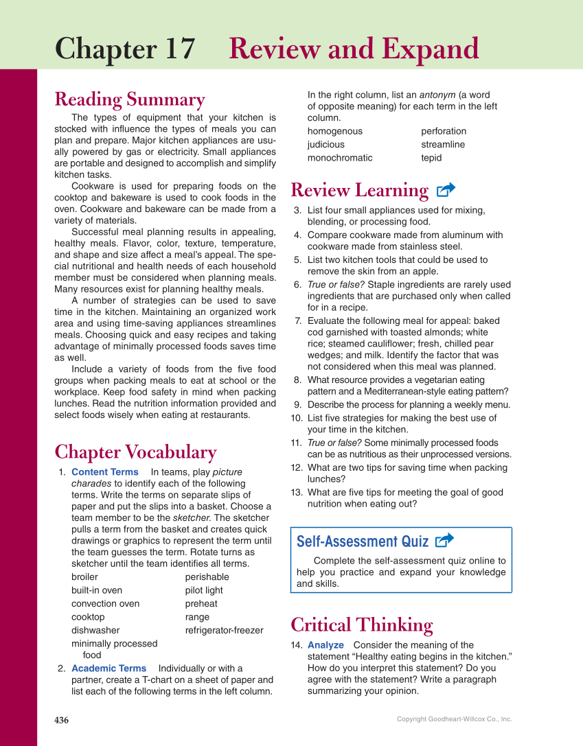 Copyright Goodheart-Willcox Co., Inc. Chapter 17 Review and Expand 436 Reading Summary The types of equipment that your kitchen is stocked with influence the types of meals you can plan and prepare. Major kitchen appliances are usu- ally powered by gas or electricity. Small appliances are portable and designed to accomplish and simplify kitchen tasks. Cookware is used for preparing foods on the cooktop and bakeware is used to cook foods in the oven. Cookware and bakeware can be made from a variety of materials. Successful meal planning results in appealing, healthy meals. Flavor, color, texture, temperature, and shape and size affect a meal’s appeal. The spe- cial nutritional and health needs of each household member must be considered when planning meals. Many resources exist for planning healthy meals. A number of strategies can be used to save time in the kitchen. Maintaining an organized work area and using time-saving appliances streamlines meals. Choosing quick and easy recipes and taking advantage of minimally processed foods saves time as well. Include a variety of foods from the five food groups when packing meals to eat at school or the workplace. Keep food safety in mind when packing lunches. Read the nutrition information provided and select foods wisely when eating at restaurants. Chapter Vocabulary 1. Content Terms In teams, play picture charades to identify each of the following terms. Write the terms on separate slips of paper and put the slips into a basket. Choose a team member to be the sketcher. The sketcher pulls a term from the basket and creates quick drawings or graphics to represent the term until the team guesses the term. Rotate turns as sketcher until the team identifies all terms. broiler built-in oven convection oven cooktop dishwasher minimally processed food perishable pilot light preheat range refrigerator-freezer 2. Academic Terms Individually or with a partner, create a T-chart on a sheet of paper and list each of the following terms in the left column. In the right column, list an antonym (a word of opposite meaning) for each term in the left column. homogenous judicious monochromatic perforation streamline tepid Review Learning 3. List four small appliances used for mixing, blending, or processing food. 4. Compare cookware made from aluminum with cookware made from stainless steel. 5. List two kitchen tools that could be used to remove the skin from an apple. 6. True or false? Staple ingredients are rarely used ingredients that are purchased only when called for in a recipe. 7. Evaluate the following meal for appeal: baked cod garnished with toasted almonds white rice steamed cauliflower fresh, chilled pear wedges and milk. Identify the factor that was not considered when this meal was planned. 8. What resource provides a vegetarian eating pattern and a Mediterranean-style eating pattern? 9. Describe the process for planning a weekly menu. 10. List five strategies for making the best use of your time in the kitchen. 11. True or false? Some minimally processed foods can be as nutritious as their unprocessed versions. 12. What are two tips for saving time when packing lunches? 13. What are five tips for meeting the goal of good nutrition when eating out? Self-Assessment Quiz Complete the self-assessment quiz online to help you practice and expand your knowledge and skills. Critical Thinking 14. Analyze Consider the meaning of the statement “Healthy eating begins in the kitchen.” How do you interpret this statement? Do you agree with the statement? Write a paragraph summarizing your opinion.