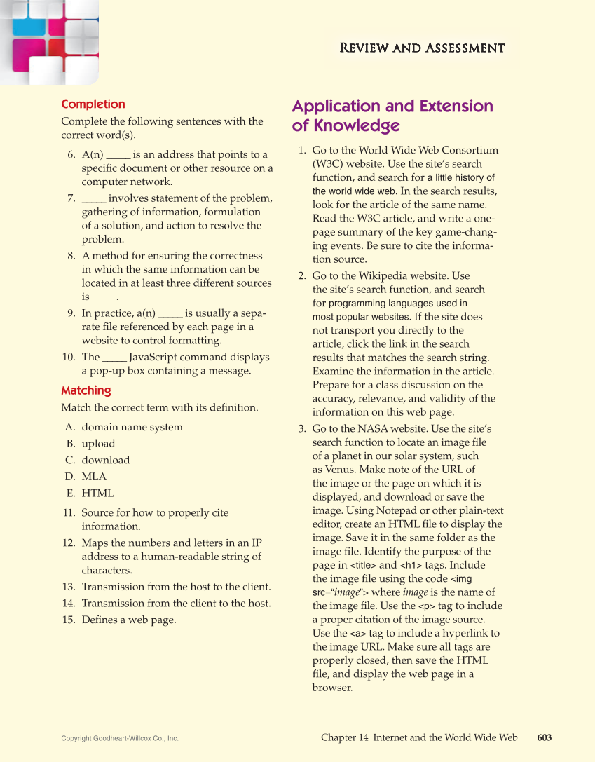 Review and AssessmenttnemssessA Review R R R e v e w w and a a n d d A A A s s e s s m e n n t t t R R R e e i e e w w w a a d d A A s s s s e e s s s s e e t t t i e e w w w a a a n n d d A A A s s s s e e s s s s m m e e n n n t t t R R R R e e v i w w s Review and Assessment Review and Assessment Chapter 14 Internet and the World Wide Web 603 Copyright Goodheart-Willcox Co., Inc. Completion Complete the following sentences with the correct word(s). 6. A(n) _____ is an address that points to a specifi c document or other resource on a computer network. 7. _____ involves statement of the problem, gathering of information, formulation of a solution, and action to resolve the problem. 8. A method for ensuring the correctness in which the same information can be located in at least three different sources is _____. 9. In practice, a(n) _____ is usually a sepa- rate fi le referenced by each page in a website to control formatting. 10. The _____ JavaScript command displays a pop-up box containing a message. Matching Match the correct term with its defi nition. A. domain name system B. upload C. download D. MLA E. HTML 11. Source for how to properly cite information. 12. Maps the numbers and letters in an IP address to a human-readable string of characters. 13. Transmission from the host to the client. 14. Transmission from the client to the host. 15. Defi nes a web page. Application and Extension of Knowledge 1. Go to the World Wide Web Consortium (W3C) website. Use the site’s search function, and search for a little history of the world wide web. In the search results, look for the article of the same name. Read the W3C article, and write a one- page summary of the key game-chang- ing events. Be sure to cite the informa- tion source. 2. Go to the Wikipedia website. Use the site’s search function, and search for programming languages used in most popular websites. If the site does not transport you directly to the article, click the link in the search results that matches the search string. Examine the information in the article. Prepare for a class discussion on the accuracy, relevance, and validity of the information on this web page. 3. Go to the NASA website. Use the site’s search function to locate an image fi le of a planet in our solar system, such as Venus. Make note of the URL of the image or the page on which it is displayed, and download or save the image. Using Notepad or other plain-text editor, create an HTML fi le to display the image. Save it in the same folder as the image fi le. Identify the purpose of the page in title and h1 tags. Include the image fi le using the code img src=“image” where image is the name of the image fi le. Use the p tag to include a proper citation of the image source. Use the a tag to include a hyperlink to the image URL. Make sure all tags are properly closed, then save the HTML fi le, and display the web page in a browser.