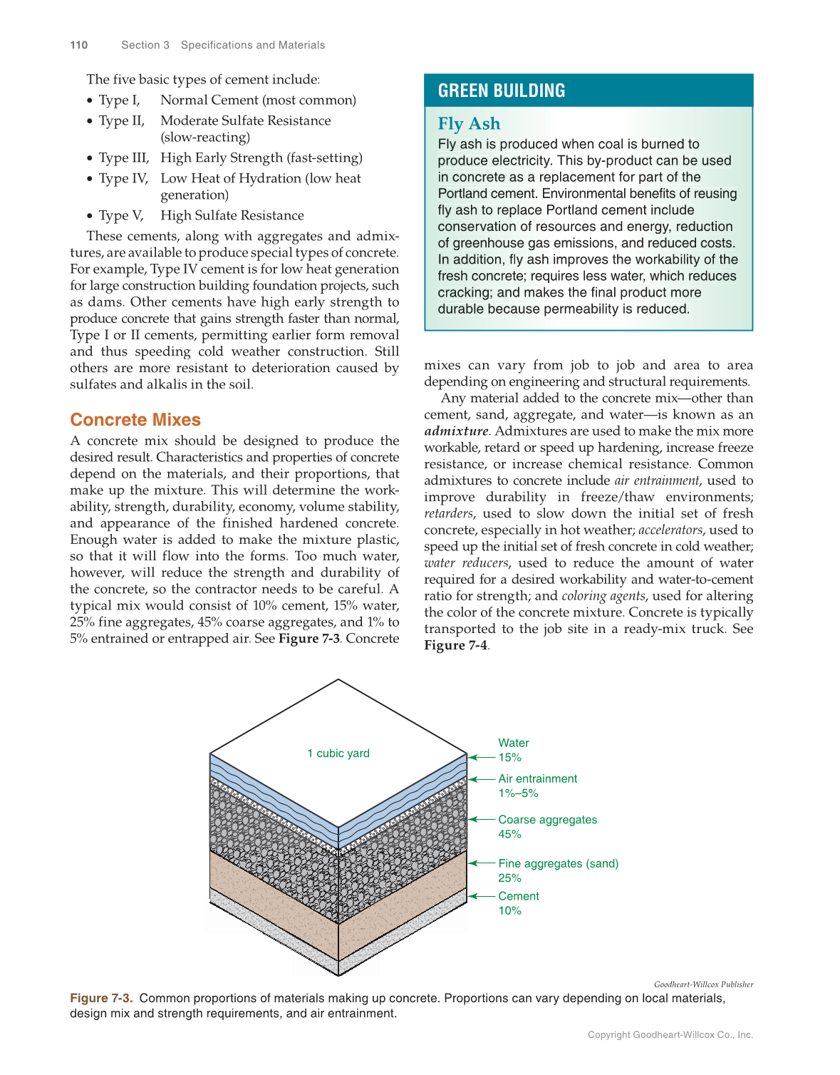 Copyright Goodheart-Willcox Co., Inc. 110 Section 3 Specifications and Materials mixes can vary from job to job and area to area depending on engineering and structural requirements. Any material added to the concrete mix—other than cement, sand, aggregate, and water—is known as an admixture. Admixtures are used to make the mix more workable, retard or speed up hardening, increase freeze resistance, or increase chemical resistance. Common admixtures to concrete include air entrainment, used to t improve durability in freeze/thaw environments retarders, used to slow down the initial set of fresh concrete, especially in hot weather accelerators, used to speed up the initial set of fresh concrete in cold weather water reducers, used to reduce the amount of water required for a desired workability and water-to-cement ratio for strength and coloring agents, used for altering the color of the concrete mixture. Concrete is typically transported to the job site in a ready-mix truck. See Figure 7-4. The five basic types of cement include: • Type I, Normal Cement (most common) • Type II, Moderate Sulfate Resistance (slow-reacting) • Type III, High Early Strength (fast-setting) • Type IV, Low Heat of Hydration (low heat generation) • Type V, High Sulfate Resistance These cements, along with aggregates and admix- tures, are available to produce special types of concrete. For example, Type IV cement is for low heat generation for large construction building foundation projects, such as dams. Other cements have high early strength to produce concrete that gains strength faster than normal, Type I or II cements, permitting earlier form removal and thus speeding cold weather construction. Still others are more resistant to deterioration caused by sulfates and alkalis in the soil. Concrete Mixes A concrete mix should be designed to produce the desired result. Characteristics and properties of concrete depend on the materials, and their proportions, that make up the mixture. This will determine the work- ability, strength, durability, economy, volume stability, and appearance of the finished hardened concrete. Enough water is added to make the mixture plastic, so that it will flow into the forms. Too much water, however, will reduce the strength and durability of the concrete, so the contractor needs to be careful. A typical mix would consist of 10% cement, 15% water, 25% fine aggregates, 45% coarse aggregates, and 1% to 5% entrained or entrapped air. See Figure 7-3. Concrete Water 15% Air entrainment 1%–5% Coarse aggregates 45% Fine aggregates (sand) 25% Cement 10% 1 cubic yard Goodheart-Willcox Publisher Figure 7-3. Common proportions of materials making up concrete. Proportions can vary depending on local materials, design mix and strength requirements, and air entrainment. Fly Ash Fly y ash s is produced o when coal is burned ne to pro od uce electricity. ec This by-product can c be u us ed in concrete c n a as a replacement for part o of the Portlan nd cement. m m Environmental benefits f s of re eu sin ng fly ash h to replace ep Portland cement includec con ns e er vation on of resources and energy, y , reduc ct ion o of gree g en house us gas emissions, and redu d uc ed cost c ts . In addition, a d fly ash improves the worka k ab ility o of the fresh s c co ncret e te requires less water, wh hi c ch reduce d es cra ac king and n d makes the final product more dur ra ble because ca permeability is reduced.u GREEN BUILDING