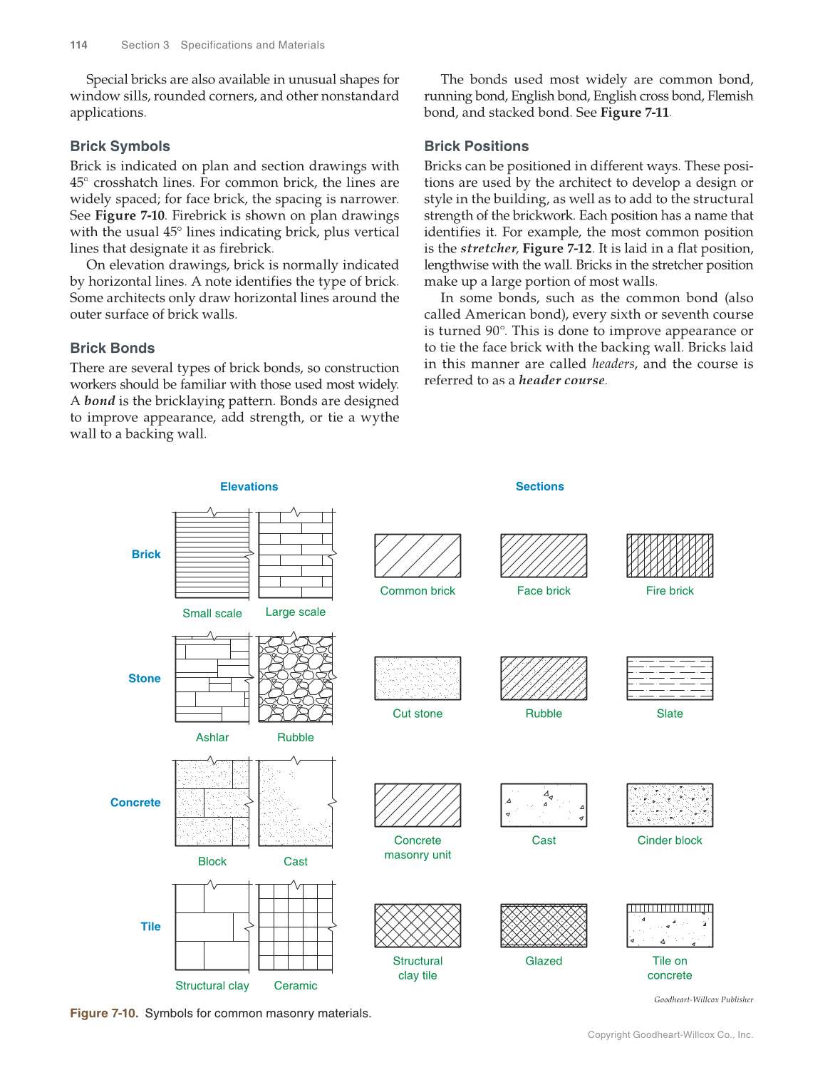 Copyright Goodheart-Willcox Co., Inc. 114 Section 3 Specifications and Materials The bonds used most widely are common bond, running bond, English bond, English cross bond, Flemish bond, and stacked bond. See Figure 7-11. Brick Positions Bricks can be positioned in different ways. These posi- tions are used by the architect to develop a design or style in the building, as well as to add to the structural strength of the brickwork. Each position has a name that identifies it. For example, the most common position is the stretcher, r r Figure 7-12. It is laid in a flat position, lengthwise with the wall. Bricks in the stretcher position make up a large portion of most walls. In some bonds, such as the common bond (also called American bond), every sixth or seventh course is turned 90°. This is done to improve appearance or to tie the face brick with the backing wall. Bricks laid in this manner are called headers, and the course is referred to as a header course. Special bricks are also available in unusual shapes for window sills, rounded corners, and other nonstandard applications. Brick Symbols Brick is indicated on plan and section drawings with 45° crosshatch lines. For common brick, the lines are widely spaced for face brick, the spacing is narrower. See Figure 7-10. Firebrick is shown on plan drawings with the usual 45° lines indicating brick, plus vertical lines that designate it as firebrick. On elevation drawings, brick is normally indicated by horizontal lines. A note identifies the type of brick. Some architects only draw horizontal lines around the outer surface of brick walls. Brick Bonds There are several types of brick bonds, so construction workers should be familiar with those used most widely. A bond is the bricklaying pattern. Bonds are designed to improve appearance, add strength, or tie a wythe wall to a backing wall. Concrete Block Structural clay Brick Stone Tile Sections Structural clay tile Elevations Cast Small scale Large scale Ashlar Rubble Ceramic Cast Cinder block Common brick Face brick Fire brick Cut stone Rubble Slate Glazed Tile on concrete Concrete masonry unit Goodheart-Willcox Publisher Figure 7-10. Symbols for common masonry materials.