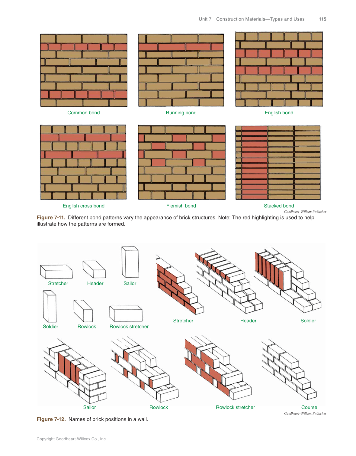 Copyright Goodheart-Willcox Co., Inc. Unit 7 Construction Materials—Types and Uses 115 Common bond Running bond English bond English cross bond Flemish bond Stacked bond Goodheart-Willcox Publisher Figure 7-11. Different bond patterns vary the appearance of brick structures. Note: The red highlighting is used to help illustrate how the patterns are formed. Rowlock Sailor Soldier Stretcher Header Sailor Rowlock Rowlock stretcher Course Stretcher Header Soldier Rowlock stretcher Goodheart-Willcox Publisher Figure 7-12. Names of brick positions in a wall.