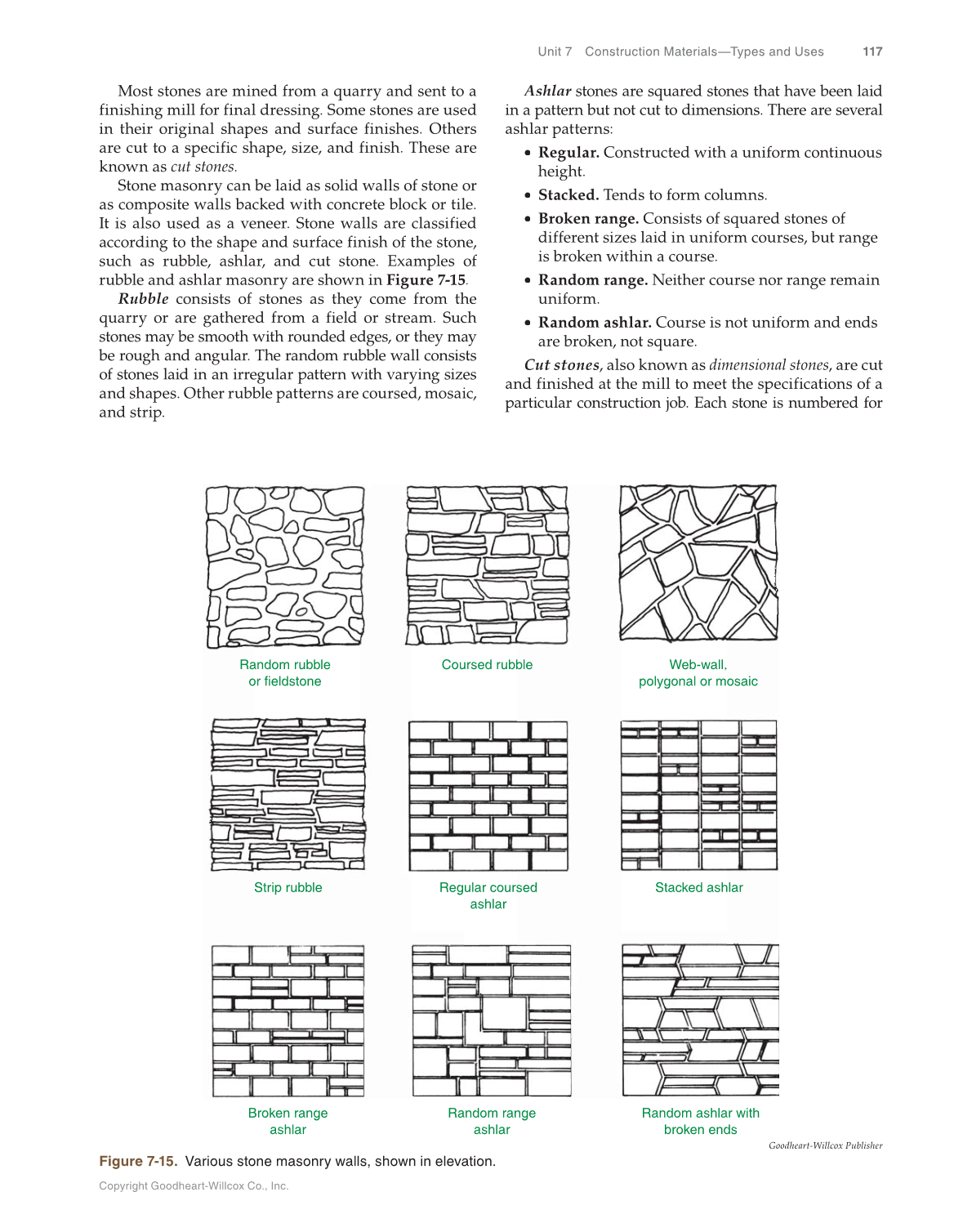 Copyright Goodheart-Willcox Co., Inc. Unit 7 Construction Materials—Types and Uses 117 Ashlar stones are squared stones that have been laid r in a pattern but not cut to dimensions. There are several ashlar patterns: • Regular. Constructed with a uniform continuous height. • Stacked. Tends to form columns. • Broken range. Consists of squared stones of different sizes laid in uniform courses, but range is broken within a course. • Random range. Neither course nor range remain uniform. • Random ashlar. Course is not uniform and ends are broken, not square. Cut stones, also known as dimensional stones, are cut and finished at the mill to meet the specifications of a particular construction job. Each stone is numbered for Most stones are mined from a quarry and sent to a finishing mill for final dressing. Some stones are used in their original shapes and surface finishes. Others are cut to a specific shape, size, and finish. These are known as cut stones. Stone masonry can be laid as solid walls of stone or as composite walls backed with concrete block or tile. It is also used as a veneer. Stone walls are classified according to the shape and surface finish of the stone, such as rubble, ashlar, and cut stone. Examples of rubble and ashlar masonry are shown in Figure 7-15. Rubble consists of stones as they come from the quarry or are gathered from a field or stream. Such stones may be smooth with rounded edges, or they may be rough and angular. The random rubble wall consists of stones laid in an irregular pattern with varying sizes and shapes. Other rubble patterns are coursed, mosaic, and strip. Random rubble or fieldstone Coursed rubble Web-wall, polygonal or mosaic Strip rubble Regular coursed ashlar Stacked ashlar Broken range ashlar Random range ashlar Random ashlar with broken ends Goodheart-Willcox Publisher Figure 7-15. Various stone masonry walls, shown in elevation.