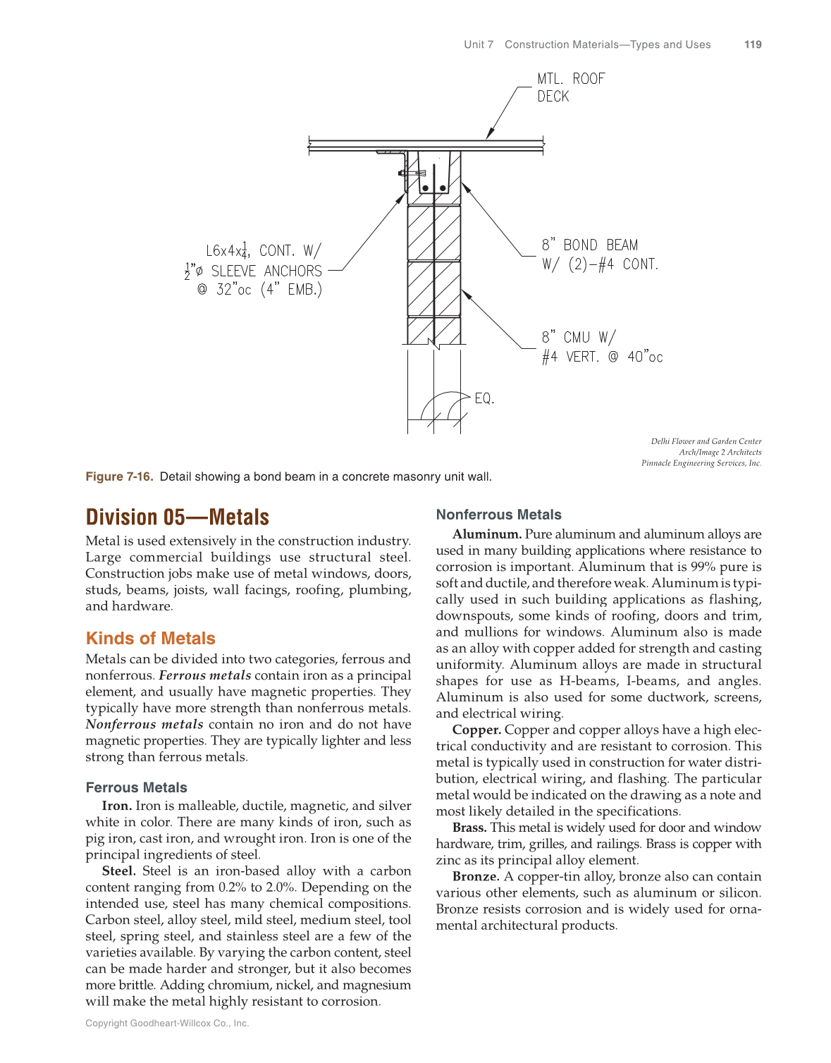 Copyright Goodheart-Willcox Co., Inc. Unit 7 Construction Materials—Types and Uses 119 Nonferrous Metals Aluminum. Pure aluminum and aluminum alloys are used in many building applications where resistance to corrosion is important. Aluminum that is 99% pure is soft and ductile, and therefore weak. Aluminum is typi- cally used in such building applications as flashing, downspouts, some kinds of roofing, doors and trim, and mullions for windows. Aluminum also is made as an alloy with copper added for strength and casting uniformity. Aluminum alloys are made in structural shapes for use as H-beams, I-beams, and angles. Aluminum is also used for some ductwork, screens, and electrical wiring. Copper. Copper and copper alloys have a high elec- trical conductivity and are resistant to corrosion. This metal is typically used in construction for water distri- bution, electrical wiring, and flashing. The particular metal would be indicated on the drawing as a note and most likely detailed in the specifications. Brass. This metal is widely used for door and window hardware, trim, grilles, and railings. Brass is copper with zinc as its principal alloy element. Bronze. A copper-tin alloy, bronze also can contain various other elements, such as aluminum or silicon. Bronze resists corrosion and is widely used for orna- mental architectural products. Division 05—Metals Metal is used extensively in the construction industry. Large commercial buildings use structural steel. Construction jobs make use of metal windows, doors, studs, beams, joists, wall facings, roofing, plumbing, and hardware. Kinds of Metals Metals can be divided into two categories, ferrous and nonferrous. Ferrous metals contain iron as a principal element, and usually have magnetic properties. They typically have more strength than nonferrous metals. Nonferrous metals contain no iron and do not have magnetic properties. They are typically lighter and less strong than ferrous metals. Ferrous Metals Iron. Iron is malleable, ductile, magnetic, and silver white in color. There are many kinds of iron, such as pig iron, cast iron, and wrought iron. Iron is one of the principal ingredients of steel. Steel. Steel is an iron-based alloy with a carbon content ranging from 0.2% to 2.0%. Depending on the intended use, steel has many chemical compositions. Carbon steel, alloy steel, mild steel, medium steel, tool steel, spring steel, and stainless steel are a few of the varieties available. By varying the carbon content, steel can be made harder and stronger, but it also becomes more brittle. Adding chromium, nickel, and magnesium will make the metal highly resistant to corrosion. Delhi Flower and Garden Center Arch/Image 2 Architects Pinnacle Engineering Services, Inc. Figure 7-16. Detail showing a bond beam in a concrete masonry unit wall.