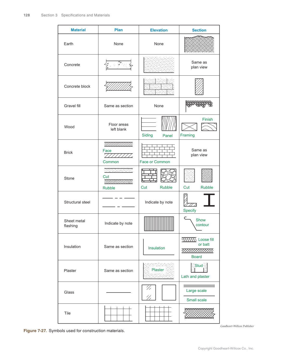 Copyright Goodheart-Willcox Co., Inc. 128 Section 3 Specifications and Materials Material Concrete Concrete block Gravel fill Same as section None Wood Floor areas left blank Siding Finish Brick Common Face or Common Same as plan view Stone Cut Structural steel Specify Sheet metal flashing Show contour Insulation Insulation Loose fill or batt Board Plaster Plaster Stud Lath and plaster Glass Small scale Tile Plan Elevation Section None None Earth Panel Framing Face Rubble Cut Rubble Cut Rubble Same as plan view Indicate by note Indicate by note Same as section Same as section Large scale Goodheart-Willcox Publisher Figure 7-27. Symbols used for construction materials.