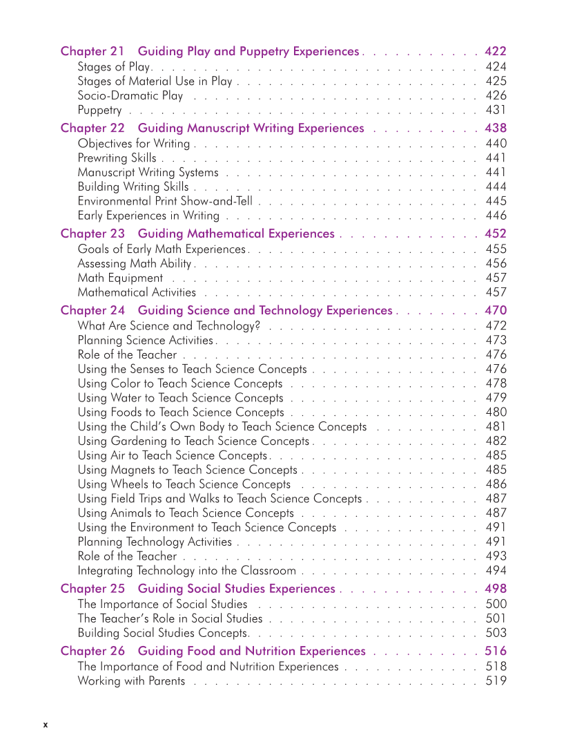 x Chapter 21 Guiding Play and Puppetry Experiences. . . . . . . . . . . 422 Stages of Play. . . . . . . . . . . . . . . . . . . . . . . . . . . . . . . 424 Stages of Material Use in Play . . . . . . . . . . . . . . . . . . . . . . . 425 Socio-Dramatic Play . . . . . . . . . . . . . . . . . . . . . . . . . . . 426 Puppetry . . . . . . . . . . . . . . . . . . . . . . . . . . . . . . . . . 431 Chapter 22 Guiding Manuscript Writing Experiences . . . . . . . . . . 438 Objectives for Writing . . . . . . . . . . . . . . . . . . . . . . . . . . . 440 Prewriting Skills . . . . . . . . . . . . . . . . . . . . . . . . . . . . . . 441 Manuscript Writing Systems . . . . . . . . . . . . . . . . . . . . . . . . 441 Building Writing Skills . . . . . . . . . . . . . . . . . . . . . . . . . . . 444 Environmental Print Show-and-Tell . . . . . . . . . . . . . . . . . . . . . 445 Early Experiences in Writing . . . . . . . . . . . . . . . . . . . . . . . . 446 Chapter 23 Guiding Mathematical Experiences . . . . . . . . . . . . . 452 Goals of Early Math Experiences. . . . . . . . . . . . . . . . . . . . . . 455 Assessing Math Ability. . . . . . . . . . . . . . . . . . . . . . . . . . . 456 Math Equipment . . . . . . . . . . . . . . . . . . . . . . . . . . . . . 457 Mathematical Activities . . . . . . . . . . . . . . . . . . . . . . . . . . 457 Chapter 24 Guiding Science and Technology Experiences . . . . . . . . 470 What Are Science and Technology? . . . . . . . . . . . . . . . . . . . . 472 Planning Science Activities. . . . . . . . . . . . . . . . . . . . . . . . . 473 Role of the Teacher . . . . . . . . . . . . . . . . . . . . . . . . . . . . 476 Using the Senses to Teach Science Concepts . . . . . . . . . . . . . . . . 476 Using Color to Teach Science Concepts . . . . . . . . . . . . . . . . . . 478 Using Water to Teach Science Concepts . . . . . . . . . . . . . . . . . . 479 Using Foods to Teach Science Concepts . . . . . . . . . . . . . . . . . . 480 Using the Child’s Own Body to Teach Science Concepts . . . . . . . . . . 481 Using Gardening to Teach Science Concepts . . . . . . . . . . . . . . . . 482 Using Air to Teach Science Concepts. . . . . . . . . . . . . . . . . . . . 485 Using Magnets to Teach Science Concepts . . . . . . . . . . . . . . . . . 485 Using Wheels to Teach Science Concepts . . . . . . . . . . . . . . . . . 486 Using Field Trips and Walks to Teach Science Concepts . . . . . . . . . . . 487 Using Animals to Teach Science Concepts . . . . . . . . . . . . . . . . . 487 Using the Environment to Teach Science Concepts . . . . . . . . . . . . . 491 Planning Technology Activities . . . . . . . . . . . . . . . . . . . . . . . 491 Role of the Teacher . . . . . . . . . . . . . . . . . . . . . . . . . . . . 493 Integrating Technology into the Classroom . . . . . . . . . . . . . . . . . 494 Chapter 25 Guiding Social Studies Experiences . . . . . . . . . . . . . 498 The Importance of Social Studies . . . . . . . . . . . . . . . . . . . . . 500 The Teacher’s Role in Social Studies . . . . . . . . . . . . . . . . . . . . 501 Building Social Studies Concepts. . . . . . . . . . . . . . . . . . . . . . 503 Chapter 26 Guiding Food and Nutrition Experiences . . . . . . . . . . 516 The Importance of Food and Nutrition Experiences . . . . . . . . . . . . . 518 Working with Parents . . . . . . . . . . . . . . . . . . . . . . . . . . . 519