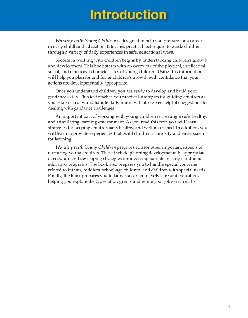 1 Introduction Working with Young Children is designed to help you prepare for a career in early childhood education. It teaches practical techniques to guide children through a variety of daily experiences in safe, educational ways. Success in working with children begins by understanding children’s growth and development. This book starts with an overview of the physical, intellectual, social, and emotional characteristics of young children. Using this information will help you plan for and foster children’s growth with confi dence that your actions are developmentally appropriate. Once you understand children, you are ready to develop and build your guidance skills. This text teaches you practical strategies for guiding children as you establish rules and handle daily routines. It also gives helpful suggestions for dealing with guidance challenges. An important part of working with young children is creating a safe, healthy, and stimulating learning environment. As you read this text, you will learn strategies for keeping children safe, healthy, and well-nourished. In addition, you will learn to provide experiences that build children’s curiosity and enthusiasm for learning. Working with Young Children prepares you for other important aspects of nurturing young children. These include planning developmentally appropriate curriculum and developing strategies for involving parents in early childhood education programs. The book also prepares you to handle special concerns related to infants, toddlers, school-age children, and children with special needs. Finally, the book prepares you to launch a career in early care and education, helping you explore the types of programs and refi ne your job search skills.