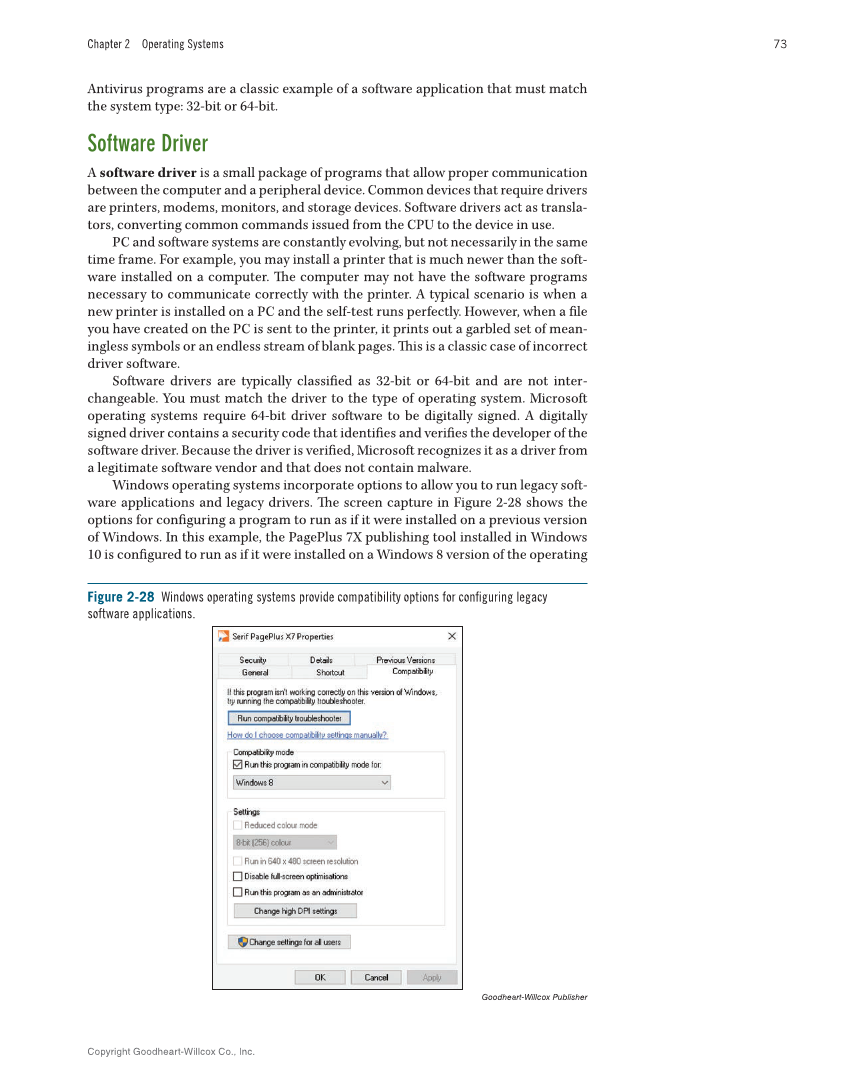 Copyright Goodheart-Willcox Co., Inc. 73 Chapter 2 Operating Systems Antivirus programs are a classic example of a software application that must match the system type: 32-bit or 64-bit. Software Driver A software driver is a small package of programs that allow proper communication between the computer and a peripheral device. Common devices that require drivers are printers, modems, monitors, and storage devices. Software drivers act as transla- tors, converting common commands issued from the CPU to the device in use. PC and software systems are constantly evolving, but not necessarily in the same time frame. For example, you may install a printer that is much newer than the soft- ware installed on a computer. Th e computer may not have the software programs necessary to communicate correctly with the printer. A typical scenario is when a new printer is installed on a PC and the self-test runs perfectly. However, when a fi le you have created on the PC is sent to the printer, it prints out a garbled set of mean- ingless symbols or an endless stream of blank pages. Th is is a classic case of incorrect driver software. Software drivers are typically classifi ed as 32-bit or 64-bit and are not inter- changeable. You must match the driver to the type of operating system. Microsoft operating systems require 64-bit driver software to be digitally signed. A digitally signed driver contains a security code that identifi es and verifi es the developer of the software driver. Because the driver is verifi ed, Microsoft recognizes it as a driver from a legitimate software vendor and that does not contain malware. Windows operating systems incorporate options to allow you to run legacy soft- ware applications and legacy drivers. Th e screen capture in Figure 2-28 shows the options for confi guring a program to run as if it were installed on a previous version of Windows. In this example, the PagePlus 7X publishing tool installed in Windows 10 is confi gured to run as if it were installed on a Windows 8 version of the operating Goodheart-Willcox Publisher Figure 2-28 Windows operating systems provide compatibility options for confi guring legacy software applications.