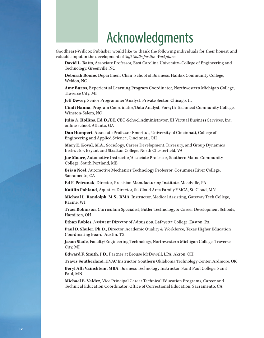 iv Acknowledgments Goodheart-Willcox Publisher would like to thank the following individuals for their honest and valuable input in the development of Soft Skills for the Workplace. David L. Batts, Associate Professor, East Carolina University–College of Engineering and Technology, Greenville, NC Deborah Boone, Department Chair, School of Business, Halifax Community College, Weldon, NC Amy Burns, Experiential Learning Program Coordinator, Northwestern Michigan College, Traverse City, MI Jeff Dewey, Senior Programmer/Analyst, Private Sector, Chicago, IL Cindi Hanna, Program Coordinator/Data Analyst, Forsyth Technical Community College, Winston-Salem, NC Julia A. Hollins, Ed.D./ET, CEO-School Administrator, JH Virtual Business Services, Inc. online school, Atlanta, GA Dan Humpert, Associate Professor Emeritus, University of Cincinnati, College of Engineering and Applied Science, Cincinnati, OH Mary E. Koval, M.A., Sociology, Career Development, Diversity, and Group Dynamics Instructor, Bryant and Stratton College, North Chesterfield, VA Joe Moore, Automotive Instructor/Associate Professor, Southern Maine Community College, South Portland, ME Brian Noel, Automotive Mechanics Technology Professor, Cosumnes River College, Sacramento, CA Ed F. Petrunak, Director, Precision Manufacturing Institute, Meadville, PA Kaitlin Pohland, Aquatics Director, St. Cloud Area Family YMCA, St. Cloud, MN Micheal L. Randolph, M.S., RMA, Instructor, Medical Assisting, Gateway Tech College, Racine, WI Traci Robinson, Curriculum Specialist, Butler Technology & Career Development Schools, Hamilton, OH Ethan Robles, Assistant Director of Admission, Lafayette College, Easton, PA Paul D. Shuler, Ph.D., Director, Academic Quality & Workforce, Texas Higher Education Coordinating Board, Austin, TX Jason Slade, Faculty/Engineering Technology, Northwestern Michigan College, Traverse City, MI Edward F. Smith, J.D., Partner at Brouse McDowell, LPA, Akron, OH Travis Southerland, HVAC Instructor, Southern Oklahoma Technology Center, Ardmore, OK Beryl Alli Vainshtein, MBA, Business Technology Instructor, Saint Paul College, Saint Paul, MN Michael E. Valdez, Vice Principal Career Technical Education Programs, Career and Technical Education Coordinator, Office of Correctional Education, Sacramento, CA