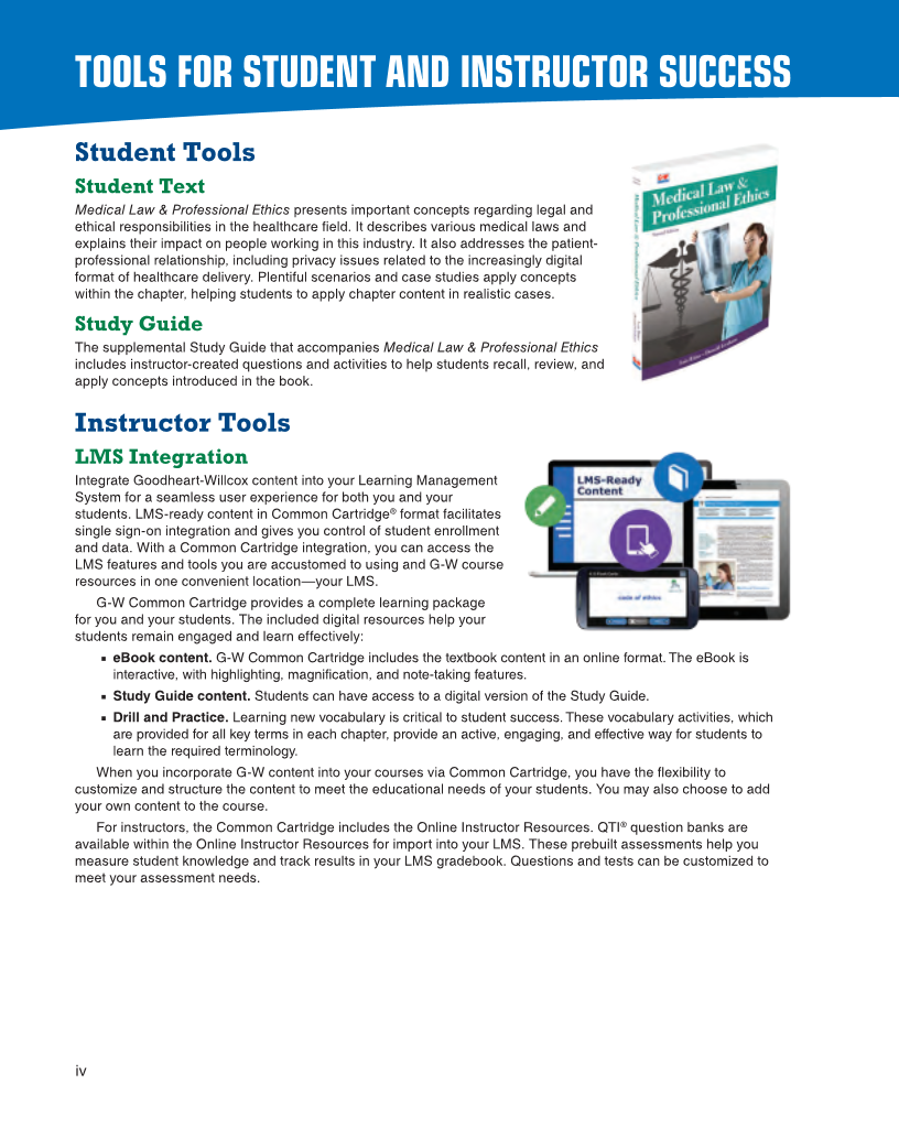 Student Tools Student Text Medical Law & Professional Ethics presents important concepts regarding legal and ethical responsibilities in the healthcare field. It describes various medical laws and explains their impact on people working in this industry. It also addresses the patient- professional relationship, including privacy issues related to the increasingly digital format of healthcare delivery. Plentiful scenarios and case studies apply concepts within the chapter, helping students to apply chapter content in realistic cases. Study Guide The supplemental Study Guide that accompanies Medical Law & Professional Ethics includes instructor-created questions and activities to help students recall, review, and apply concepts introduced in the book. Instructor Tools LMS Integration Integrate Goodheart-Willcox content into your Learning Management System for a seamless user experience for both you and your students. LMS-ready content in Common Cartridge® format facilitates single sign-on integration and gives you control of student enrollment and data. With a Common Cartridge integration, you can access the LMS features and tools you are accustomed to using and G-W course resources in one convenient location—your LMS. G-W Common Cartridge provides a complete learning package for you and your students. The included digital resources help your students remain engaged and learn effectively: ■ ■ eBook content. G-W Common Cartridge includes the textbook content in an online format. The eBook is interactive, with highlighting, magnification, and note-taking features. ■ ■■ Study Guide content. Students can have access to a digital version of the Study Guide. ■ Drill and Practice. Learning new vocabulary is critical to student success. These vocabulary activities, which are provided for all key terms in each chapter, provide an active, engaging, and effective way for students to learn the required terminology. When you incorporate G-W content into your courses via Common Cartridge, you have the flexibility to customize and structure the content to meet the educational needs of your students. You may also choose to add your own content to the course. For instructors, the Common Cartridge includes the Online Instructor Resources. QTI® question banks are available within the Online Instructor Resources for import into your LMS. These prebuilt assessments help you measure student knowledge and track results in your LMS gradebook. Questions and tests can be customized to meet your assessment needs. TOOLS FOR STUDENT AND INSTRUCTOR SUCCESS iv