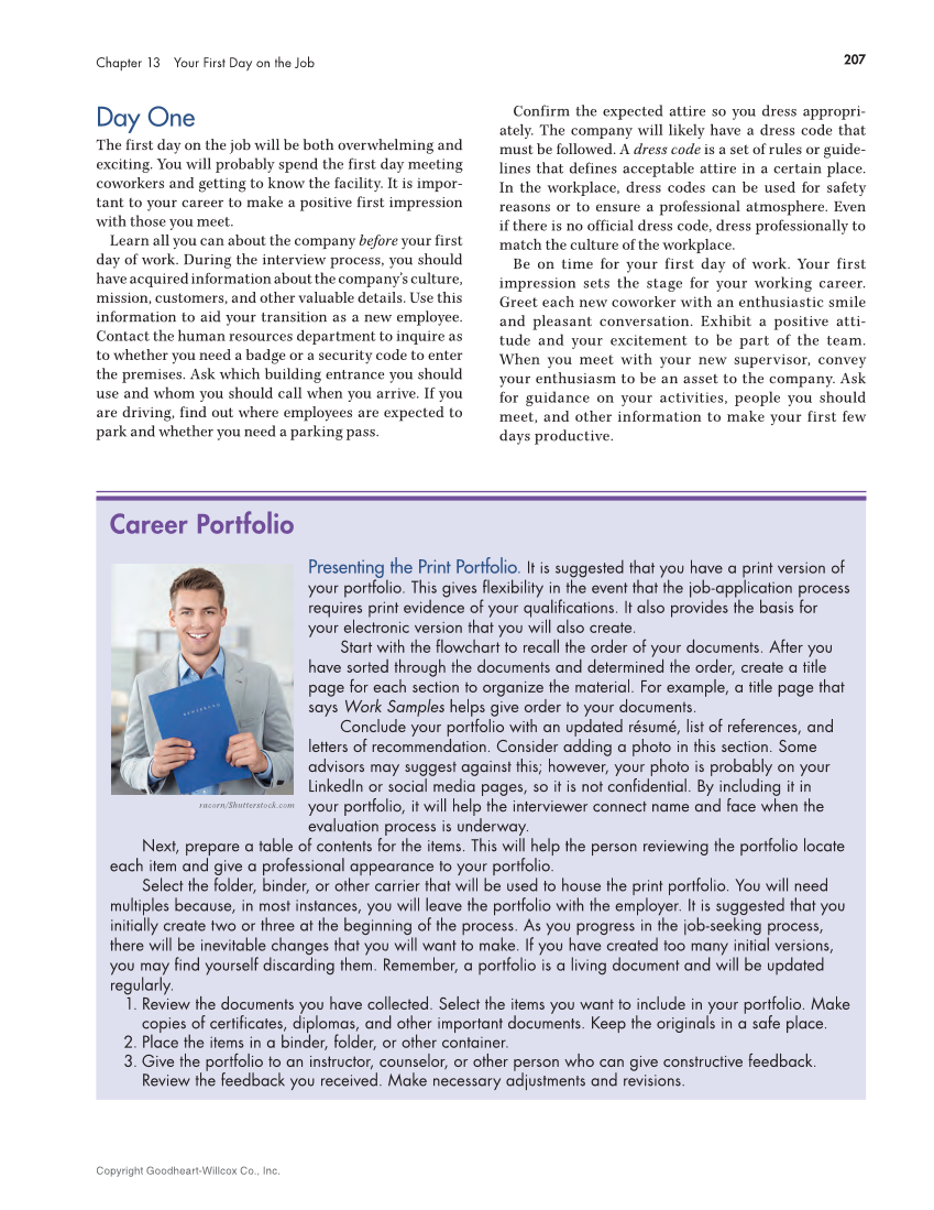 Confirm the expected attire so you dress appropri- ately. The company will likely have a dress code that must be followed. A dress code is a set of rules or guide- lines that defines acceptable attire in a certain place. In the workplace, dress codes can be used for safety reasons or to ensure a professional atmosphere. Even if there is no official dress code, dress professionally to match the culture of the workplace. Be on time for your first day of work. Your first impression sets the stage for your working career. Greet each new coworker with an enthusiastic smile and pleasant conversation. Exhibit a positive atti- tude and your excitement to be part of the team. When you meet with your new supervisor, convey your enthusiasm to be an asset to the company. Ask for guidance on your activities, people you should meet, and other information to make your first few days productive. Day One The first day on the job will be both overwhelming and exciting. You will probably spend the first day meeting coworkers and getting to know the facility. It is impor- tant to your career to make a positive first impression with those you meet. Learn all you can about the company before your first day of work. During the interview process, you should have acquired information about the company’s culture, mission, customers, and other valuable details. Use this information to aid your transition as a new employee. Contact the human resources department to inquire as to whether you need a badge or a security code to enter the premises. Ask which building entrance you should use and whom you should call when you arrive. If you are driving, find out where employees are expected to park and whether you need a parking pass. Career Portfolio Presenting the Print Portfolio. It is suggested that you have a print version of your portfolio. This gives flexibility in the event that the job-application process requires print evidence of your qualifications. It also provides the basis for your electronic version that you will also create. Start with the fl owchart to recall the order of your documents. After you have sorted through the documents and determined the order, create a title page for each section to organize the material. For example, a title page that says Work Samples helps give order to your documents. Conclude your portfolio with an updated résumé, list of references, and letters of recommendation. Consider adding a photo in this section. Some advisors may suggest against this however, your photo is probably on your LinkedIn or social media pages, so it is not confi dential. By including it in your portfolio, it will help the interviewer connect name and face when the evaluation process is underway. Next, prepare a table of contents for the items. This will help the person reviewing the portfolio locate each item and give a professional appearance to your portfolio. Select the folder, binder, or other carrier that will be used to house the print portfolio. You will need multiples because, in most instances, you will leave the portfolio with the employer. It is suggested that you initially create two or three at the beginning of the process. As you progress in the job-seeking process, there will be inevitable changes that you will want to make. If you have created too many initial versions, you may fi nd yourself discarding them. Remember, a portfolio is a living document and will be updated regularly. 1. Review the documents you have collected. Select the items you want to include in your portfolio. Make copies of certificates, diplomas, and other important documents. Keep the originals in a safe place. 2. Place the items in a binder, folder, or other container. 3. Give the portfolio to an instructor, counselor, or other person who can give constructive feedback. Review the feedback you received. Make necessary adjustments and revisions. racorn/Shutterstock.com Copyright Goodheart-Willcox Co., Inc. 207 Chapter 13 Your First Day on the Job