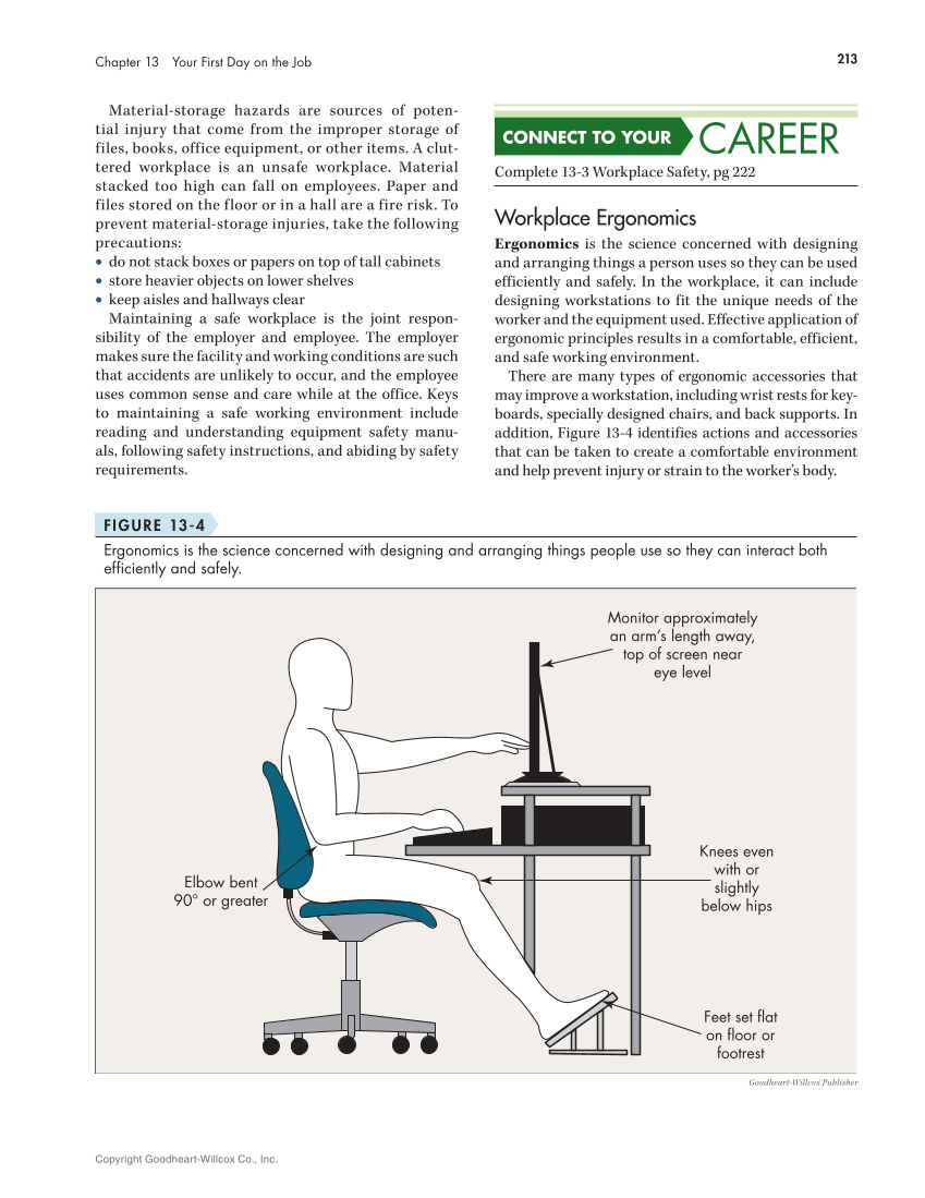 Material-storage hazards are sources of poten- tial injury that come from the improper storage of files, books, office equipment, or other items. A clut- tered workplace is an unsafe workplace. Material stacked too high can fall on employees. Paper and files stored on the floor or in a hall are a fire risk. To prevent material-storage injuries, take the following precautions: • do not stack boxes or papers on top of tall cabinets • store heavier objects on lower shelves • keep aisles and hallways clear Maintaining a safe workplace is the joint respon- sibility of the employer and employee. The employer makes sure the facility and working conditions are such that accidents are unlikely to occur, and the employee uses common sense and care while at the office. Keys to maintaining a safe working environment include reading and understanding equipment safety manu- als, following safety instructions, and abiding by safety requirements. Complete 13-3 Workplace Safety, pg 222 CONNECT TO YOUR CAREER Workplace Ergonomics Ergonomics is the science concerned with designing and arranging things a person uses so they can be used efficiently and safely. In the workplace, it can include designing workstations to fit the unique needs of the worker and the equipment used. Effective application of ergonomic principles results in a comfortable, efficient, and safe working environment. There are many types of ergonomic accessories that may improve a workstation, including wrist rests for key- boards, specially designed chairs, and back supports. In addition, Figure 13-4 identifies actions and accessories that can be taken to create a comfortable environment and help prevent injury or strain to the worker’s body. Monitor approximately an arm’s length away, top of screen near eye level Knees even with or slightly below hips Feet set flat on floor or footrest Elbow bent 90° or greater Goodheart-Willcox Publisher FIGURE 13-4 Ergonomics is the science concerned with designing and arranging things people use so they can interact both efficiently and safely. Copyright Goodheart-Willcox Co., Inc. 213 Chapter 13 Your First Day on the Job