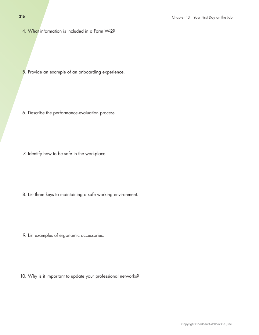 4. What information is included in a Form W-2? 5. Provide an example of an onboarding experience. 6. Describe the performance-evaluation process. 7. Identify how to be safe in the workplace. 8. List three keys to maintaining a safe working environment. 9. List examples of ergonomic accessories. 10. Why is it important to update your professional networks? Copyright Goodheart-Willcox Co., Inc. 216 Chapter 13 Your First Day on the Job