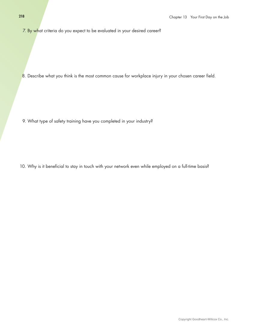 7. By what criteria do you expect to be evaluated in your desired career? 8. Describe what you think is the most common cause for workplace injury in your chosen career field. 9. What type of safety training have you completed in your industry? 10. Why is it beneficial to stay in touch with your network even while employed on a full-time b asis? Copyright Goodheart-Willcox Co., Inc. 218 Chapter 13 Your First Day on the Job