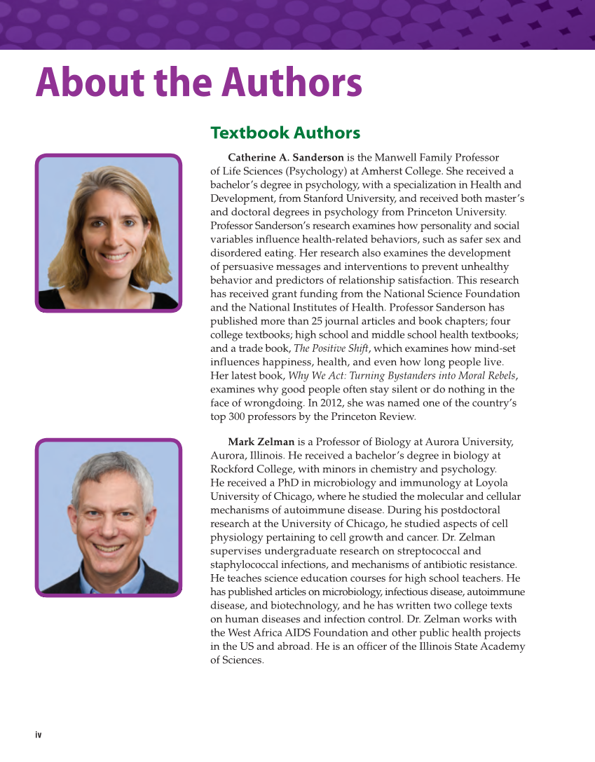 iv About the Authors Textbook Authors Catherine A. Sanderson is the Manwell Family Professor of Life Sciences (Psychology) at Amherst College. She received a bachelor’s degree in psychology, with a specialization in Health and Development, from Stanford University, and received both master’s and doctoral degrees in psychology from Princeton University. Professor Sanderson’s research examines how personality and social variables influence health-related behaviors, such as safer sex and disordered eating. Her research also examines the development of persuasive messages and interventions to prevent unhealthy behavior and predictors of relationship satisfaction. This research has received grant funding from the National Science Foundation and the National Institutes of Health. Professor Sanderson has published more than 25 journal articles and book chapters four college textbooks high school and middle school health textbooks and a trade book, The Positive Shift, which examines how mind-set influences happiness, health, and even how long people live. Her latest book, Why We Act: Turning Bystanders into Moral Rebels, examines why good people often stay silent or do nothing in the face of wrongdoing. In 2012, she was named one of the country’s top 300 professors by the Princeton Review. Mark Zelman is a Professor of Biology at Aurora University, Aurora, Illinois. He received a bachelor’s degree in biology at Rockford College, with minors in chemistry and psychology. He received a PhD in microbiology and immunology at Loyola University of Chicago, where he studied the molecular and cellular mechanisms of autoimmune disease. During his postdoctoral research at the University of Chicago, he studied aspects of cell physiology pertaining to cell growth and cancer. Dr. Zelman supervises undergraduate research on streptococcal and staphylococcal infections, and mechanisms of antibiotic resistance. He teaches science education courses for high school teachers. He has published articles on microbiology, infectious disease, autoimmune disease, and biotechnology, and he has written two college texts on human diseases and infection control. Dr. Zelman works with the West Africa AIDS Foundation and other public health projects in the US and abroad. He is an officer of the Illinois State Academy of Sciences.