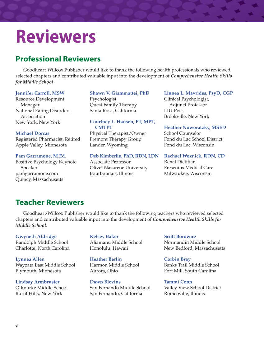vi Reviewers Professional Reviewers Goodheart-Willcox Publisher would like to thank the following health professionals who reviewed selected chapters and contributed valuable input into the development of Comprehensive Health Skills for Middle School. Teacher Reviewers Goodheart-Willcox Publisher would like to thank the following teachers who reviewed selected chapters and contributed valuable input into the development of Comprehensive Health Skills for Middle School. Jennifer Carroll, MSW Resource Development Manager National Eating Disorders Association New York, New York Michael Dorcas Registered Pharmacist, Retired Apple Valley, Minnesota Pam Garramone, M.Ed. Positive Psychology Keynote Speaker pamgarramone.com Quincy, Massachusetts Shawn V. Giammattei, PhD Psychologist Quest Family Therapy Santa Rosa, California Courtney L. Hansen, PT, MPT, CMTPT Physical Therapist/Owner Fremont Therapy Group Lander, Wyoming Deb Kimberlin, PhD, RDN, LDN Associate Professor Olivet Nazarene University Bourbonnais, Illinois Linnea L. Mavrides, PsyD, CGP Clinical Psychologist, Adjunct Professor LIU-Post Brookville, New York Heather Noworatzky, MSED School Counselor Fond du Lac School District Fond du Lac, Wisconsin Rachael Woznick, RDN, CD Renal Dietitian Fresenius Medical Care Milwaukee, Wisconsin Gwyneth Aldridge Randolph Middle School Charlotte, North Carolina Lynnea Allen Wayzata East Middle School Plymouth, Minnesota Lindsay Armbruster O’Rourke Middle School Burnt Hills, New York Kelsey Baker Aliamanu Middle School Honolulu, Hawaii Heather Berlin Harmon Middle School Aurora, Ohio Dawn Blevins San Fernando Middle School San Fernando, California Scott Borowicz Normandin Middle School New Bedford, Massachusetts Corbin Bray Banks Trail Middle School Fort Mill, South Carolina Tammi Conn Valley View School District Romeoville, Illinois