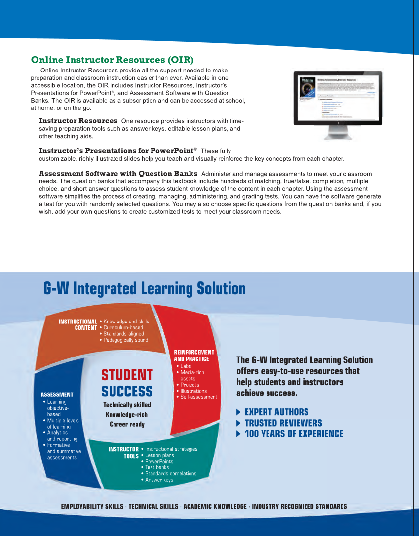 Online Instructor Resources (OIR) Online Instructor Resources provide all the support needed to make preparation and classroom instruction easier than ever. Available in one accessible location, the OIR includes Instructor Resources, Instructor’s Presentations for PowerPoint®, and Assessment Software with Question Banks. The OIR is available as a subscription and can be accessed at school, at home, or on the go. Instructor Resources One resource provides instructors with time- saving preparation tools such as answer keys, editable lesson plans, and other teaching aids. Instructor’s Presentations for PowerPoint® These fully customizable, richly illustrated slides help you teach and visually reinforce the key concepts from each chapter. Assessment Software with Question Banks Administer and manage assessments to meet your classroom needs. The question banks that accompany this textbook include hundreds of matching, true/false, completion, multiple choice, and short answer questions to assess student knowledge of the content in each chapter. Using the assessment software simplifies the process of creating, managing, administering, and grading tests. You can have the software generate a test for you with randomly selected questions. You may also choose specific questions from the question banks and, if you wish, add your own questions to create customized tests to meet your classroom needs. EMPLOYABILITY SKILLS ∙ TECHNICAL SKILLS ∙ ACADEMIC KNOWLEDGE ∙ INDUSTRY RECOGNIZED STANDARDS The G-W Integrated Learning Solution offers easy-to-use resources that help students and instructors achieve success. EXPERT AUTHORS TRUSTED REVIEWERS 100 YEARS OF EXPERIENCE G-W Integrated Learning Solution ASSESSMENT • Learning objective- based • Multiple levels of learning • Analytics and reporting • Formative and summative assessments • Knowledge and skills • Curriculum-based • Standards-aligned • Pedagogically sound INSTRUCTIONAL CONTENT INSTRUCTOR TOOLS • Instructional strategies • Lesson plans • PowerPoints • Test banks • Standards correlations • Answer keys REINFORCEMENT AND PRACTICE • Labs • Media-rich assets • Projects • Illustrations • Self-assessment STUDENT SUCCESS Technically skilled Knowledge-rich Career ready