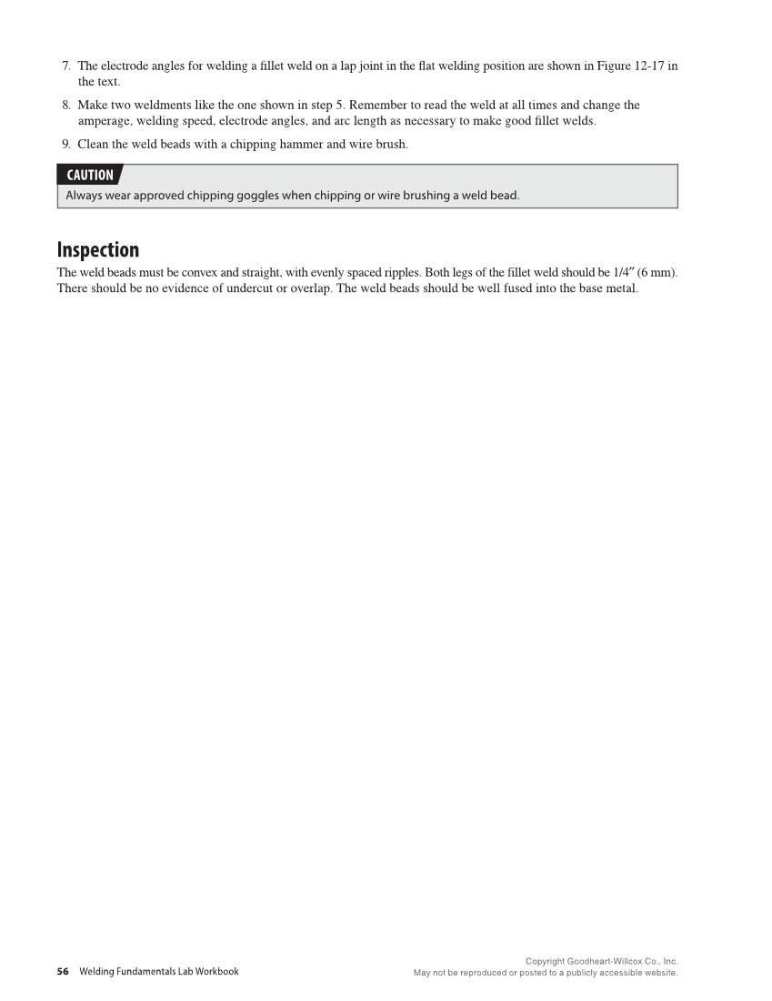 Copyright Goodheart-Willcox Co., Inc. May not be reproduced or posted to a publicly accessible website. 56 Welding Fundamentals Lab Workbook 7. The electrode angles for welding a fillet weld on a lap joint in the flat welding position are shown in Figure 12-17 in the text. 8. Make two weldments like the one shown in step 5. Remember to read the weld at all times and change the amperage, welding speed, electrode angles, and arc length as necessary to make good fillet welds. 9. Clean the weld beads with a chipping hammer and wire brush. Always wear approved chipping goggles when chipping or wire brushing a weld bead. CAUTION Inspection The weld beads must be convex and straight, with evenly spaced ripples. Both legs of the fillet weld should be 1/4″ (6 mm). There should be no evidence of undercut or overlap. The weld beads should be well fused into the base metal.