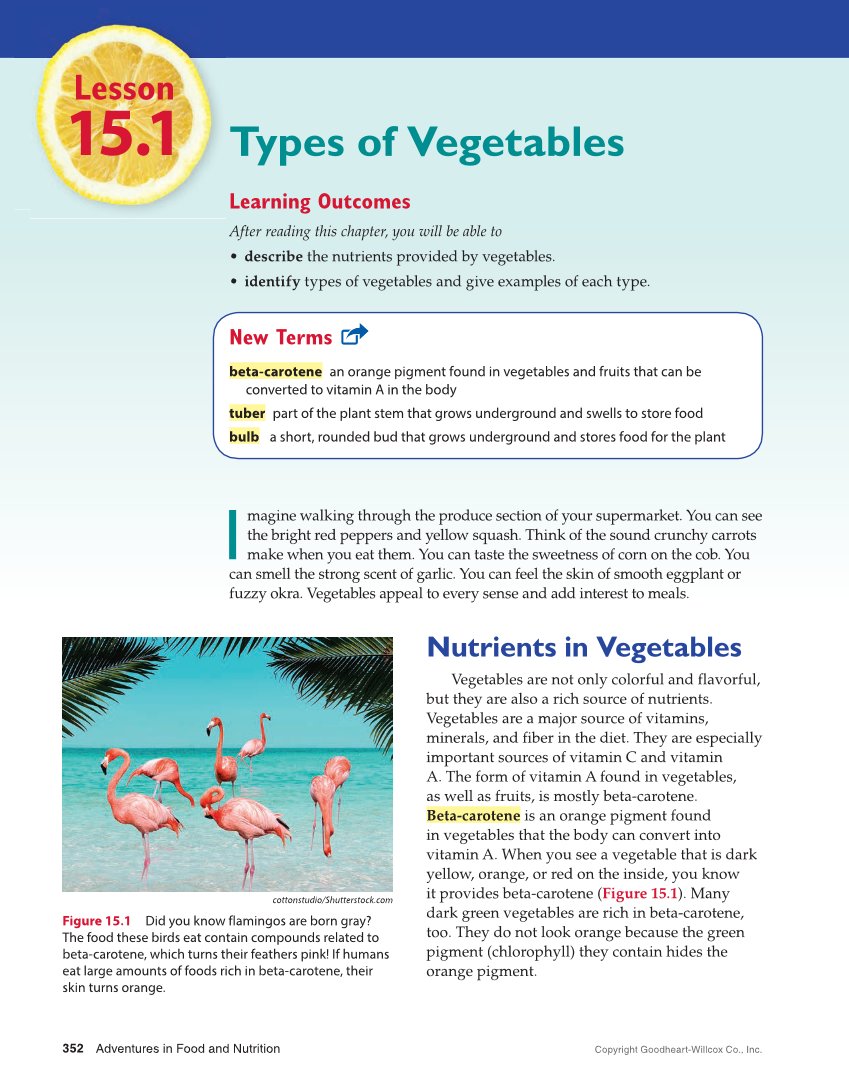Lesson 15.1 Types of Vegetables Learning Outcomes After reading this chapter, you will be able to • describe the nutrients provided by vegetables. • identify types of vegetables and give examples of each type. I magine walking through the produce section of your supermarket. You can see the bright red peppers and yellow squash. Think of the sound crunchy carrots make when you eat them. You can taste the sweetness of corn on the cob. You can smell the strong scent of garlic. You can feel the skin of smooth eggplant or fuzzy okra. Vegetables appeal to every sense and add interest to meals. Nutrients in Vegetables Vegetables are not only colorful and flavorful, but they are also a rich source of nutrients. Vegetables are a major source of vitamins, minerals, and fiber in the diet. They are especially important sources of vitamin C and vitamin A. The form of vitamin A found in vegetables, as well as fruits, is mostly beta-carotene. Beta-carotene is an orange pigment found in vegetables that the body can convert into vitamin A. When you see a vegetable that is dark yellow, orange, or red on the inside, you know it provides beta-carotene (Figure 15.1). Many dark green vegetables are rich in beta-carotene, too. They do not look orange because the green pigment (chlorophyll) they contain hides the orange pigment. New Terms beta-carotene an orange pigment found in vegetables and fruits that can be converted to vitamin A in the body tuber part of the plant stem that grows underground and swells to store food bulb a short, rounded bud that grows underground and stores food for the plant cottonstudio/Shutterstock.com Figure 15.1 Did you know flamingos are born gray? The food these birds eat contain compounds related to beta-carotene, which turns their feathers pink! If humans eat large amounts of foods rich in beta-carotene, their skin turns orange. Adventures in Food and Nutrition Copyright Goodheart-Willcox Co., Inc. 352