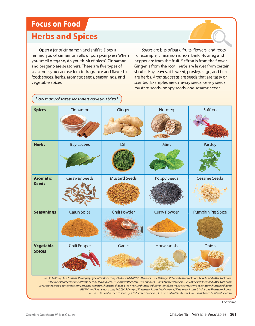 Focus on Food Herbs and Spices Open a jar of cinnamon and sniff it. Does it remind you of cinnamon rolls or pumpkin pies? When you smell oregano, do you think of pizza? Cinnamon and oregano are seasoners. There are fi ve types of seasoners you can use to add fragrance and fl avor to food: spices, herbs, aromatic seeds, seasonings, and vegetable spices. Spices are bits of bark, fruits, fl owers, and roots. For example, cinnamon is from bark. Nutmeg and pepper are from the fruit. Saff ron is from the fl ower. Ginger is from the root. Herbs are leaves from certain shrubs. Bay leaves, dill weed, parsley, sage, and basil are herbs. Aromatic seeds are seeds that are tasty or scented. Examples are caraway seeds, celery seeds, mustard seeds, poppy seeds, and sesame seeds. Continued Top to bottom, l to r: Swapan Photography/Shutterstock.com JIANG HONGYAN/Shutterstock.com Valentyn Volkov/Shutterstock.com bonchan/Shutterstock.com P Maxwell Photography/Shutterstock.com Moving Moment/Shutterstock.com Peter Hermes Furian/Shutterstock.com Valentina Proskurina/Shutterstock.com Maks Narodenko/Shutterstock.com Maxim Striganov/Shutterstock.com Diana Taliun/Shutterstock.com Yamabika Y/Shutterstock.com domnitsky/Shutterstock.com BW Folsom/Shutterstock.com FADEDinkDesigns/Shutterstock.com Ivaylo Ivanov/Shutterstock.com BW Folsom/Shutterstock.com M. Unal Ozmen/Shutterstock.com Ledo/Shutterstock.com Kateryna Bibro/Shutterstock.com iprachenko/Shutterstock.com Spices Cinnamon Ginger Nutmeg Saffron Herbs Bay Leaves Dill Mint Parsley Aromatic Seeds Caraway Seeds Mustard Seeds Poppy Seeds Sesame Seeds Seasonings Cajun Spice Chili Powder Curry Powder Pumpkin Pie Spice Vegetable Spices Chili Pepper Garlic Horseradish Onion How many of these seasoners have you tried? 361 Copyright Goodheart-Willcox Co., Inc. Chapter 15 Versatile Vegetables