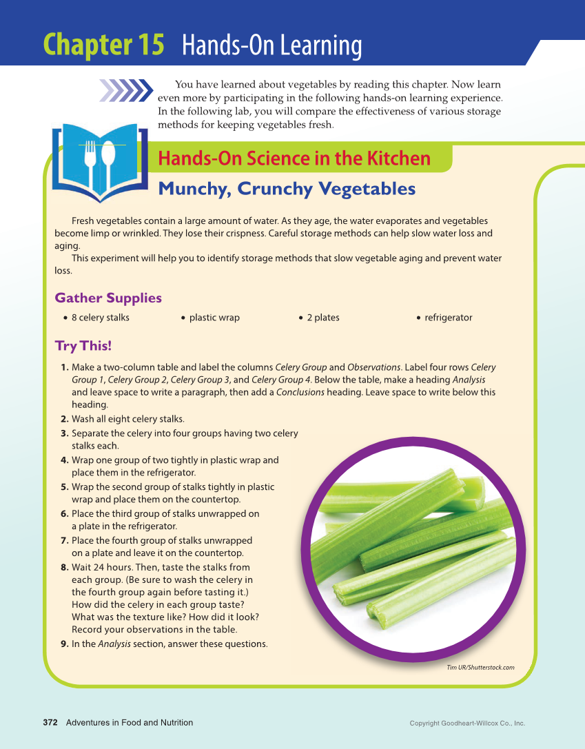 Chapter 15 Chapter 15 Hands-On Learning Hands-On Learning You have learned about vegetables by reading this chapter. Now learn even more by participating in the following hands-on learning experience. In the following lab, you will compare the effectiveness of various storage methods for keeping vegetables fresh. Hands-On Science in the Kitchen Munchy, Crunchy Vegetables Fresh vegetables contain a large amount of water. As they age, the water evaporates and vegetables become limp or wrinkled. They lose their crispness. Careful storage methods can help slow water loss and aging. This experiment will help you to identify storage methods that slow vegetable aging and prevent water loss. Gather Supplies • 8 celery stalks • plastic wrap • 2 plates • refrigerator Try This! 1. Make a two-column table and label the columns Celery Group and Observations. Label four rows Celery Group 1, Celery Group 2, Celery Group 3, and Celery Group 4. Below the table, make a heading Analysis and leave space to write a paragraph, then add a Conclusions heading. Leave space to write below this heading. 2. Wash all eight celery stalks. 3. Separate the celery into four groups having two celery stalks each. 4. Wrap one group of two tightly in plastic wrap and place them in the refrigerator. 5. Wrap the second group of stalks tightly in plastic wrap and place them on the countertop. 6. Place the third group of stalks unwrapped on a plate in the refrigerator. 7. Place the fourth group of stalks unwrapped on a plate and leave it on the countertop. 8. Wait 24 hours. Then, taste the stalks from each group. (Be sure to wash the celery in the fourth group again before tasting it.) How did the celery in each group taste? What was the texture like? How did it look? Record your observations in the table. 9. In the Analysis section, answer these questions. ry Tim UR/Shutterstock.com Adventures in Food and Nutrition Copyright Goodheart-Willcox Co., Inc. 372