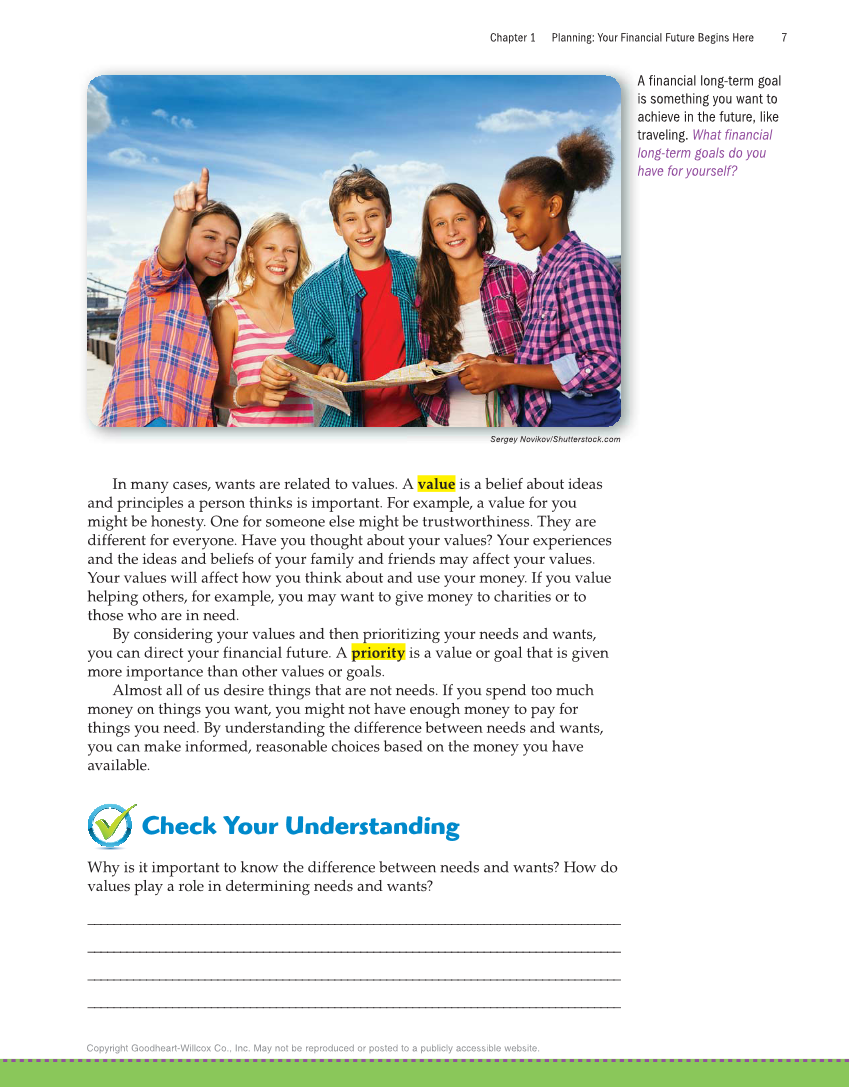 Chapter 1 Planning: Your Financial Future Begins Here 7 Copyright Goodheart-Willcox Co., Inc. May not be reproduced or posted to a publicly accessible website. In many cases, wants are related to values. A value is a belief about ideas and principles a person thinks is important. For example, a value for you might be honesty. One for someone else might be trustworthiness. They are different for everyone. Have you thought about your values? Your experiences and the ideas and beliefs of your family and friends may affect your values. Your values will affect how you think about and use your money. If you value helping others, for example, you may want to give money to charities or to those who are in need. By considering your values and then prioritizing your needs and wants, you can direct your financial future. A priority is a value or goal that is given more importance than other values or goals. Almost all of us desire things that are not needs. If you spend too much money on things you want, you might not have enough money to pay for things you need. By understanding the difference between needs and wants, you can make informed, reasonable choices based on the money you have available. Check Your Understanding Why is it important to know the difference between needs and wants? How do values play a role in determining needs and wants? __________________________________________________________________________________ __________________________________________________________________________________ __________________________________________________________________________________ __________________________________________________________________________________ Sergey Novikov/Shutterstock.com A financial long-term goal is something you want to achieve in the future, like traveling. What financial long-term goals do you have for yourself?