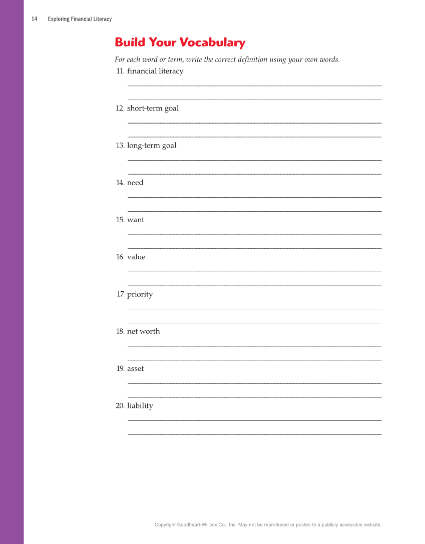 Exploring Financial Literacy 14 Copyright Goodheart-Willcox Co., Inc. May not be reproduced or posted to a publicly accessible website. Build Your Vocabulary For each word or term, write the correct definition using your own words. 11. financial literacy ______________________________________________________________________________ ______________________________________________________________________________ 12. short-term goal ______________________________________________________________________________ ______________________________________________________________________________ 13. long-term goal ______________________________________________________________________________ ______________________________________________________________________________ 14. need ______________________________________________________________________________ ______________________________________________________________________________ 15. want ______________________________________________________________________________ ______________________________________________________________________________ 16. value ______________________________________________________________________________ ______________________________________________________________________________ 17. priority ______________________________________________________________________________ ______________________________________________________________________________ 18. net worth ______________________________________________________________________________ ______________________________________________________________________________ 19. asset ______________________________________________________________________________ ______________________________________________________________________________ 20. liability ______________________________________________________________________________ ______________________________________________________________________________