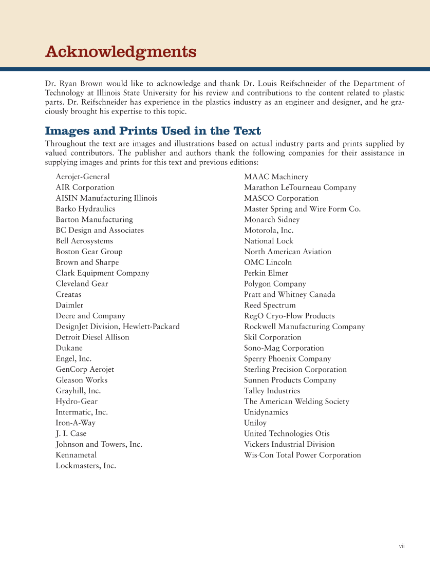 vii Acknowledgments Images and Prints Used in the Text Throughout the text are images and illustrations based on actual industry parts and prints supplied by valued contributors. The publisher and authors thank the following companies for their assistance in supplying images and prints for this text and previous editions: Dr. Ryan Brown would like to acknowledge and thank Dr. Louis Reifschneider of the Department of Technology at Illinois State University for his review and contributions to the content related to plastic parts. Dr. Reifschneider has experience in the plastics industry as an engineer and designer, and he gra- ciously brought his expertise to this topic. Aerojet-General AIR Corporation AISIN Manufacturing Illinois Barko Hydraulics Barton Manufacturing BC Design and Associates Bell Aerosystems Boston Gear Group Brown and Sharpe Clark Equipment Company Cleveland Gear Creatas Daimler Deere and Company DesignJet Division, Hewlett-Packard Detroit Diesel Allison Dukane Engel, Inc. GenCorp Aerojet Gleason Works Grayhill, Inc. Hydro-Gear Intermatic, Inc. Iron-A-Way J. I. Case Johnson and Towers, Inc. Kennametal Lockmasters, Inc. MAAC Machinery Marathon LeTourneau Company MASCO Corporation Master Spring and Wire Form Co. Monarch Sidney Motorola, Inc. National Lock North American Aviation OMC Lincoln Perkin Elmer Polygon Company Pratt and Whitney Canada Reed Spectrum RegO Cryo-Flow Products Rockwell Manufacturing Company Skil Corporation Sono-Mag Corporation Sperry Phoenix Company Sterling Precision Corporation Sunnen Products Company Talley Industries The American Welding Society Unidynamics Uniloy United Technologies Otis Vickers Industrial Division Wis⋅Con Total Power Corporation