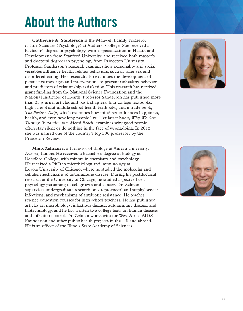 About the Authors Catherine A. Sanderson is the Manwell Family Professor of Life Sciences (Psychology) at Amherst College. She received a bachelor’s degree in psychology, with a specialization in Health and Development, from Stanford University, and received both master’s and doctoral degrees in psychology from Princeton University. Professor Sanderson’s research examines how personality and social variables influence health-related behaviors, such as safer sex and disordered eating. Her research also examines the development of persuasive messages and interventions to prevent unhealthy behavior and predictors of relationship satisfaction. This research has received grant funding from the National Science Foundation and the National Institutes of Health. Professor Sanderson has published more than 25 journal articles and book chapters four college textbooks high school and middle school health textbooks and a trade book, The Positive Shift, which examines how mind-set influences happiness, health, and even how long people live. Her latest book, Why We Act: Turning Bystanders into Moral Rebels, examines why good people often stay silent or do nothing in the face of wrongdoing. In 2012, she was named one of the country’s top 300 professors by the Princeton Review. Mark Zelman is a Professor of Biology at Aurora University, Aurora, Illinois. He received a bachelor’s degree in biology at Rockford College, with minors in chemistry and psychology. He received a PhD in microbiology and immunology at Loyola University of Chicago, where he studied the molecular and cellular mechanisms of autoimmune disease. During his postdoctoral research at the University of Chicago, he studied aspects of cell physiology pertaining to cell growth and cancer. Dr. Zelman supervises undergraduate research on streptococcal and staphylococcal infections, and mechanisms of antibiotic resistance. He teaches science education courses for high school teachers. He has published articles on microbiology, infectious disease, autoimmune disease, and biotechnology, and he has written two college texts on human diseases and infection control. Dr. Zelman works with the West Africa AIDS Foundation and other public health projects in the US and abroad. He is an officer of the Illinois State Academy of Sciences. iii