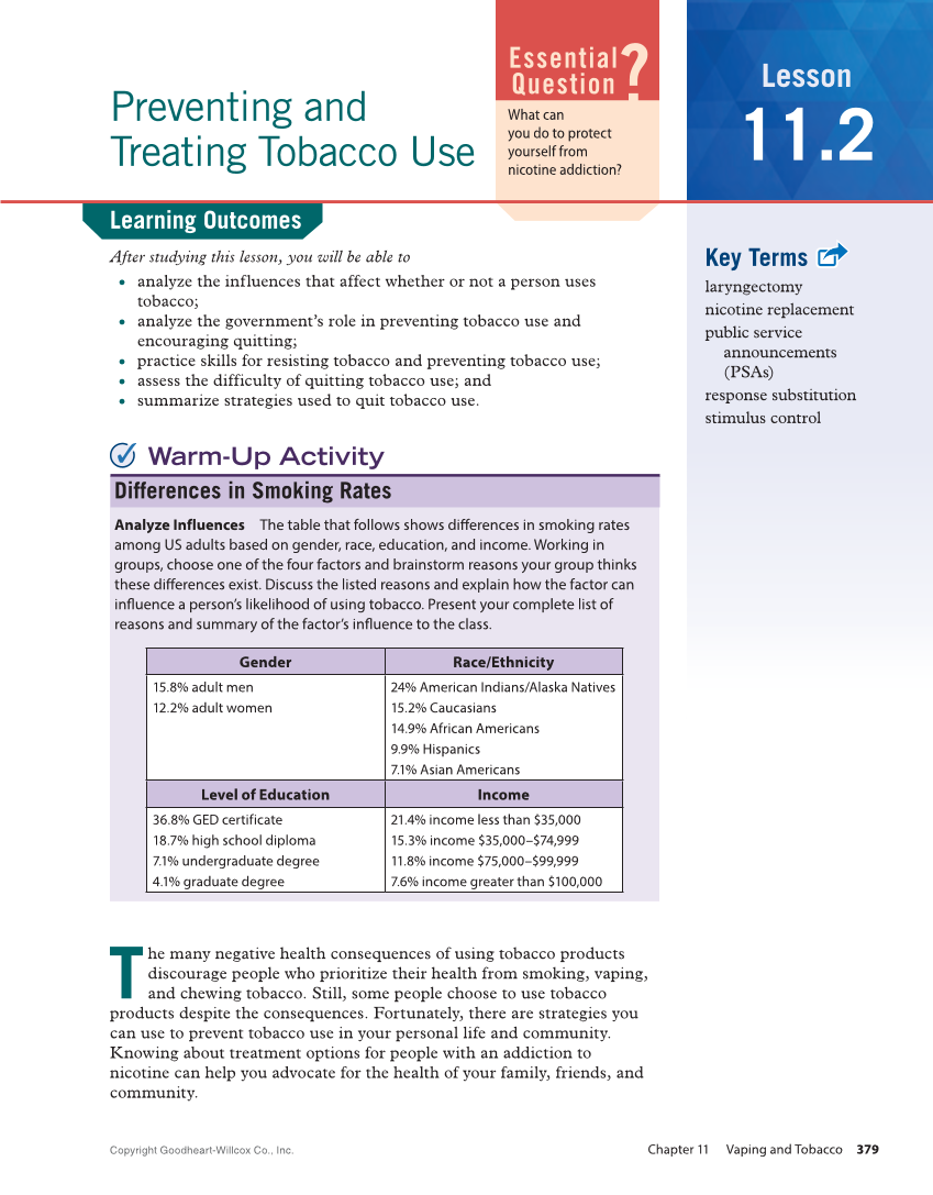 ? Lesson 11.2 Essential Question What can you do to protect yourself from nicotine addiction? Key Terms laryngectomy nicotine replacement public service announcements (PSAs) response substitution stimulus control Preventing and Treating Tobacco Use Analyze Influences The table that follows shows differences in smoking rates among US adults based on gender, race, education, and income. Working in groups, choose one of the four factors and brainstorm reasons your group thinks these differences exist. Discuss the listed reasons and explain how the factor can influence a person’s likelihood of using tobacco. Present your complete list of reasons and summary of the factor’s influence to the class. Gender Race/Ethnicity 15.8% adult men 12.2% adult women 24% American Indians/Alaska Natives 15.2% Caucasians 14.9% African Americans 9.9% Hispanics 7.1% Asian Americans Level of Education Income 36.8% GED certificate 18.7% high school diploma 7.1% undergraduate degree 4.1% graduate degree 21.4% income less than $35,000 15.3% income $35,000–$74,999 11.8% income $75,000–$99,999 7.6% income greater than $100,000 Learning Outcomes After studying this lesson, you will be able to ● ● analyze the influences that affect whether or not a person uses tobacco ● ● analyze the government’s role in preventing tobacco use and encouraging quitting ● ●● practice skills for resisting tobacco and preventing tobacco use ●● assess the difficulty of quitting tobacco use and ● summarize strategies used to quit tobacco use. Warm-Up Activity Differences in Smoking Rates T he many negative health consequences of using tobacco products discourage people who prioritize their health from smoking, vaping, and chewing tobacco. Still, some people choose to use tobacco products despite the consequences. Fortunately, there are strategies you can use to prevent tobacco use in your personal life and community. Knowing about treatment options for people with an addiction to nicotine can help you advocate for the health of your family, friends, and community. Copyright Goodheart-Willcox Co., Inc. Chapter 11 Vaping and Tobacco 379