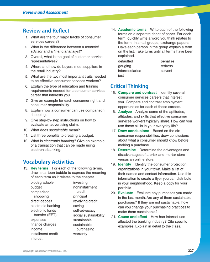 227 Copyright Goodheart-Willcox Co., Inc. Review and Assessment Review and Refl ect 1. What are the four major tracks of consumer services careers? 2. What is the difference between a financial advisor and a financial analyst? 3. Overall, what is the goal of customer service representatives? 4. Where and how do buyers meet suppliers in the retail industry? 5. What are the two most important traits needed to be effective consumer services workers? 6. Explain the type of education and training requirements needed for a consumer services career that interests you. 7. Give an example for each consumer right and consumer responsibility. 8. Explain how a consumer can use comparison shopping. 9. Give step-by-step instructions on how to evaluate an advertising claim. 10. What does sustainable mean? 11. List three benefits to creating a budget. 12. What is electronic banking? Give an example of a transaction that can be made using electronic banking. Vocabulary Activities 13. Key terms For each of the following terms, draw a cartoon bubble to express the meaning of each term as it relates to the chapter. biodegradable budget comparison shopping direct deposit electronic banking electronic funds transfer (EFT) expenses finance charges income installment credit interest investing noninstallment credit principal revolving credit saving self-advocacy social sustainability sustainable sustainable purchasing warranty 14. Academic terms Write each of the following terms on a separate sheet of paper. For each term, quickly write a word you think relates to the term. In small groups, exchange papers. Have each person in the group explain a term on the list. Take turns until all terms have been explained. defaulted gouging intermediaries just penalize redress solvent Critical Thinking 15. Compare and contrast Identify several consumer services careers that interest you. Compare and contrast employment opportunities for each of these careers. 16. Analyze Analyze some of the aptitudes, attitudes, and skills that effective consumer services workers typically share. How can you use these skills in your everyday life? 17. Draw conclusions Based on the six consumer responsibilities, draw conclusions about what a consumer should know before making a purchase. 18. Determine Determine the advantages and disadvantages of a brick and mortar store versus an online store. 19. Identify Identify the consumer protection organizations in your town. Make a list of their names and contact information. Use this information to create a flyer you can distribute in your neighborhood. Keep a copy for your portfolio. 20. Evaluate Evaluate any purchases you made in the last month. Are any of them sustainable purchases? If they are not sustainable, how can you change your purchasing practices to make them sustainable? 21. Cause and effect How has Internet use affected the banking industry? Cite specific examples. Explain in detail to the class.