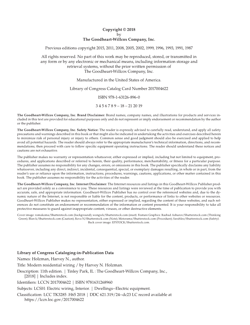 Copyright © 2018 by The Goodheart-Willcox Company, Inc. Previous editions copyright 2015, 2011, 2008, 2005, 2002, 1999, 1996, 1993, 1991, 1987 All rights reserved. No part of this work may be reproduced, stored, or transmitted in any form or by any electronic or mechanical means, including information storage and retrieval systems, without the prior written permission of The Goodheart-Willcox Company, Inc. Manufactured in the United States of America. Library of Congress Catalog Card Number 2017004622 ISBN 978-1-63126-896-0 3 4 5 6 7 8 9 – 18 – 21 20 19 The Goodheart-Willcox Company, Inc. Brand Disclaimer: Brand names, company names, and illustrations for products and services in- cluded in this text are provided for educational purposes only and do not represent or imply endorsement or recommendation by the author or the publisher. The Goodheart-Willcox Company, Inc. Safety Notice: The reader is expressly advised to carefully read, understand, and apply all safety precautions and warnings described in this book or that might also be indicated in undertaking the activities and exercises described herein to minimize risk of personal injury or injury to others. Common sense and good judgment should also be exercised and applied to help avoid all potential hazards. The reader should always refer to the appropriate manufacturer’s technical information, directions, and recom- mendations then proceed with care to follow specifi c equipment operating instructions. The reader should understand these notices and cautions are not exhaustive. The publisher makes no warranty or representation whatsoever, either expressed or implied, including but not limited to equipment, pro- cedures, and applications described or referred to herein, their quality, performance, merchantability, or fi tness for a particular purpose. The publisher assumes no responsibility for any changes, errors, or omissions in this book. The publisher specifi cally disclaims any liability whatsoever, including any direct, indirect, incidental, consequential, special, or exemplary damages resulting, in whole or in part, from the reader’s use or reliance upon the information, instructions, procedures, warnings, cautions, applications, or other matter contained in this book. The publisher assumes no responsibility for the activities of the reader. The Goodheart-Willcox Company, Inc. Internet Disclaimer: The Internet resources and listings in this Goodheart-Willcox Publisher prod- uct are provided solely as a convenience to you. These resources and listings were reviewed at the time of publication to provide you with accurate, safe, and appropriate information. Goodheart-Willcox Publisher has no control over the referenced websites and, due to the dy- namic nature of the Internet, is not responsible or liable for the content, products, or performance of links to other websites or resources. Goodheart-Willcox Publisher makes no representation, either expressed or implied, regarding the content of these websites, and such ref- erences do not constitute an endorsement or recommendation of the information or content presented. It is your responsibility to take all protective measures to guard against inappropriate content, viruses, or other destructive elements. Cover image: romakoma/Shutterstock.com (background) wongwk/Shutterstock.com (inset). Feature Graphics: Rashad Ashurov/Shutterstock.com (Thinking Green) Blan-k/Shutterstock.com (Caution) Rova N/Shutterstock.com (Note) Motorama/Shutterstock.com (Procedure) Sarahleo/Shutterstock.com (Safety). Back cover image: EPSTOCK/Shutterstock.com. Library of Congress Cataloging-in-Publication Data Names: Holzman, Harvey N., author. Title: Modern residential wiring / by Harvey N. Holzman. Description: 11th edition. | Tinley Park, IL : The Goodheart-Willcox Company, Inc., [2018] | Includes index. Identifi ers: LCCN 2017004622 | ISBN 9781631268960 Subjects: LCSH: Electric wiring, Interior. | Dwellings--Electric equipment. Classifi cation: LCC TK3285 .H65 2018 | DDC 621.319/24--dc23 LC record available at https://lccn.loc.gov/2017004622 FM.indd ii FM.indd ii 8/8/2019 1:49:53 PM 8/8/2019 1:49:53 PM