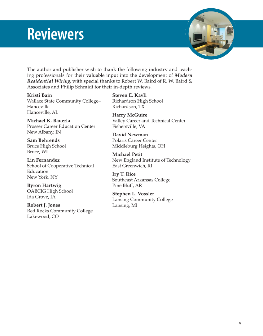 v Reviewers The author and publisher wish to thank the following industry and teach- ing professionals for their valuable input into the development of Modern Residential Wiring, with special thanks to Robert W. Baird of R. W. Baird & g g Associates and Philip Schmidt for their in-depth reviews. Kristi Bain Wallace State Community College– Hanceville Hanceville, AL Michael K. Bauerla Prosser Career Education Center New Albany, IN Sam Behrends Bruce High School Bruce, WI Lin Fernandez School of Cooperative Technical Education New York, NY Byron Hartwig OABCIG High School Ida Grove, IA Robert J. Jones Red Rocks Community College Lakewood, CO Steven E. Kavli Richardson High School Richardson, TX Harry McGuire Valley Career and Technical Center Fishersville, VA David Newman Polaris Career Center Middleburg Heights, OH Michael Petit New England Institute of Technology East Greenwich, RI Iry T. Rice Southeast Arkansas College Pine Bluff, AR Stephen L. Vossler Lansing Community College Lansing, MI