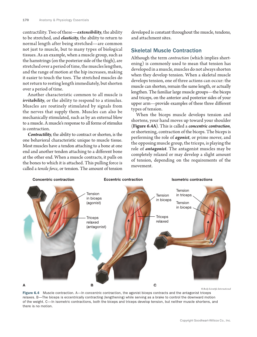 170 Anatomy & Physiology Essentials Copyright Goodheart-Willcox Co., Inc. developed is constant throughout the muscle, tendons, and attachment sites. Skeletal Muscle Contraction Although the term contraction (which implies short- ening) is commonly used to mean that tension has developed in a muscle, muscles do not always shorten when they develop tension. When a skeletal muscle develops tension, one of three actions can occur: the muscle can shorten, remain the same length, or actually lengthen. The familiar large muscle groups—the biceps and triceps, on the anterior and posterior sides of your upper arm—provide examples of these three different types of tension. When the biceps muscle develops tension and shortens, your hand moves up toward your shoulder (Figure 6.4A). This is called a concentric contraction, or shortening, contraction of the biceps. The biceps is performing the role of agonist, or prime mover, and the opposing muscle group, the triceps, is playing the role of antagonist. The antagonist muscles may be completely relaxed or may develop a slight amount of tension, depending on the requirements of the movement. contractility. Two of these—extensibility, the ability to be stretched, and elasticity, the ability to return to normal length after being stretched—are common not just to muscle, but to many types of biological tissues. As an example, when a muscle group, such as the hamstrings (on the posterior side of the thigh), are stretched over a period of time, the muscles lengthen, and the range of motion at the hip increases, making it easier to touch the toes. The stretched muscles do not return to resting length immediately, but shorten over a period of time. Another characteristic common to all muscle is irritability, or the ability to respond to a stimulus. Muscles are routinely stimulated by signals from the nerves that supply them. Muscles can also be mechanically stimulated, such as by an external blow to a muscle. A muscle’s response to all forms of stimulus is contraction. Contractility, the ability to contract or shorten, is the one behavioral characteristic unique to muscle tissue. Most muscles have a tendon attaching to a bone at one end and another tendon attaching to a different bone at the other end. When a muscle contracts, it pulls on the bones to which it is attached. This pulling force is called a tensile force, or tension. The amount of tension A B C Eccentric contraction Isometric contractions Triceps relaxed (antagonist) Triceps relaxed Tension in triceps Tension in biceps (agonist) Tension in biceps Tension in biceps Concentric contraction © Body Scientific International Figure 6.4 Muscle contraction. A—In concentric contraction, the agonist biceps contracts and the antagonist triceps relaxes. B—The biceps is eccentrically contracting (lengthening) while serving as a brake to control the downward motion of the weight. C—In isometric contractions, both the biceps and triceps develop tension, but neither muscle shortens, and there is no motion.