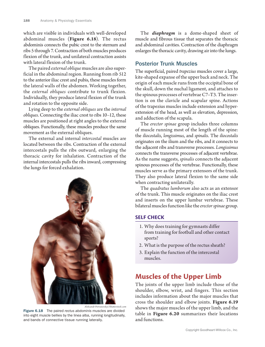 188 Anatomy & Physiology Essentials Copyright Goodheart-Willcox Co., Inc. The diaphragm is a dome-shaped sheet of muscle and fibrous tissue that separates the thoracic and abdominal cavities. Contraction of the diaphragm enlarges the thoracic cavity, drawing air into the lungs. Posterior Trunk Muscles The superficial, paired trapezius muscles cover a large, kite-shaped expanse of the upper back and neck. The origin of each muscle runs from the occipital bone of the skull, down the nuchal ligament, and attaches to the spinous processes of vertebrae C7–T3. The inser- tion is on the clavicle and scapular spine. Actions of the trapezius muscles include extension and hyper- extension of the head, as well as elevation, depression, and adduction of the scapula. The erector spinae group includes three columns of muscle running most of the length of the spine: the iliocostalis, longissimus, and spinalis. The iliocostalis originates on the ilium and the ribs, and it connects to the adjacent ribs and transverse processes. Longissimus connects the transverse processes of adjacent vertebrae. As the name suggests, spinalis connects the adjacent spinous processes of the vertebrae. Functionally, these muscles serve as the primary extensors of the trunk. They also produce lateral flexion to the same side when contracting unilaterally. The quadratus lumborum also acts as an extensor of the trunk. This muscle originates on the iliac crest and inserts on the upper lumbar vertebrae. These bilateral muscles function like the erector spinae group. SELF CHECK 1. Why does training for gymnasts differ from training for football and other contact sports? 2. What is the purpose of the rectus sheath? 3. Explain the function of the intercostal muscles. Muscles of the Upper Limb The joints of the upper limb include those of the shoulder, elbow, wrist, and fingers. This section includes information about the major muscles that cross the shoulder and elbow joints. Figure 6.19 shows the major muscles of the upper limb, and the table in Figure 6.20 summarizes their locations and functions. which are visible in individuals with well-developed abdominal muscles (Figure 6.18). The rectus abdominis connects the pubic crest to the sternum and ribs 5 through 7. Contraction of both muscles produces flexion of the trunk, and unilateral contraction assists with lateral flexion of the trunk. The paired external oblique muscles are also super- ficial in the abdominal region. Running from rib 512 to the anterior iliac crest and pubis, these muscles form the lateral walls of the abdomen. Working together, the external obliques contribute to trunk flexion. Individually, they produce lateral flexion of the trunk and rotation to the opposite side. Lying deep to the external obliques are the internal obliques. Connecting the iliac crest to ribs 10–12, these muscles are positioned at right angles to the external obliques. Functionally, these muscles produce the same movement as the external obliques. The external and internal intercostal muscles are located between the ribs. Contraction of the external intercostals pulls the ribs outward, enlarging the thoracic cavity for inhalation. Contraction of the internal intercostals pulls the ribs inward, compressing the lungs for forced exhalation. Aleksandr Petrunovskyi/Shutterstock.com Figure 6.18 The paired rectus abdominis muscles are divided into eight muscle bellies by the linea alba, running longitudinally, and bands of connective tissue running laterally.