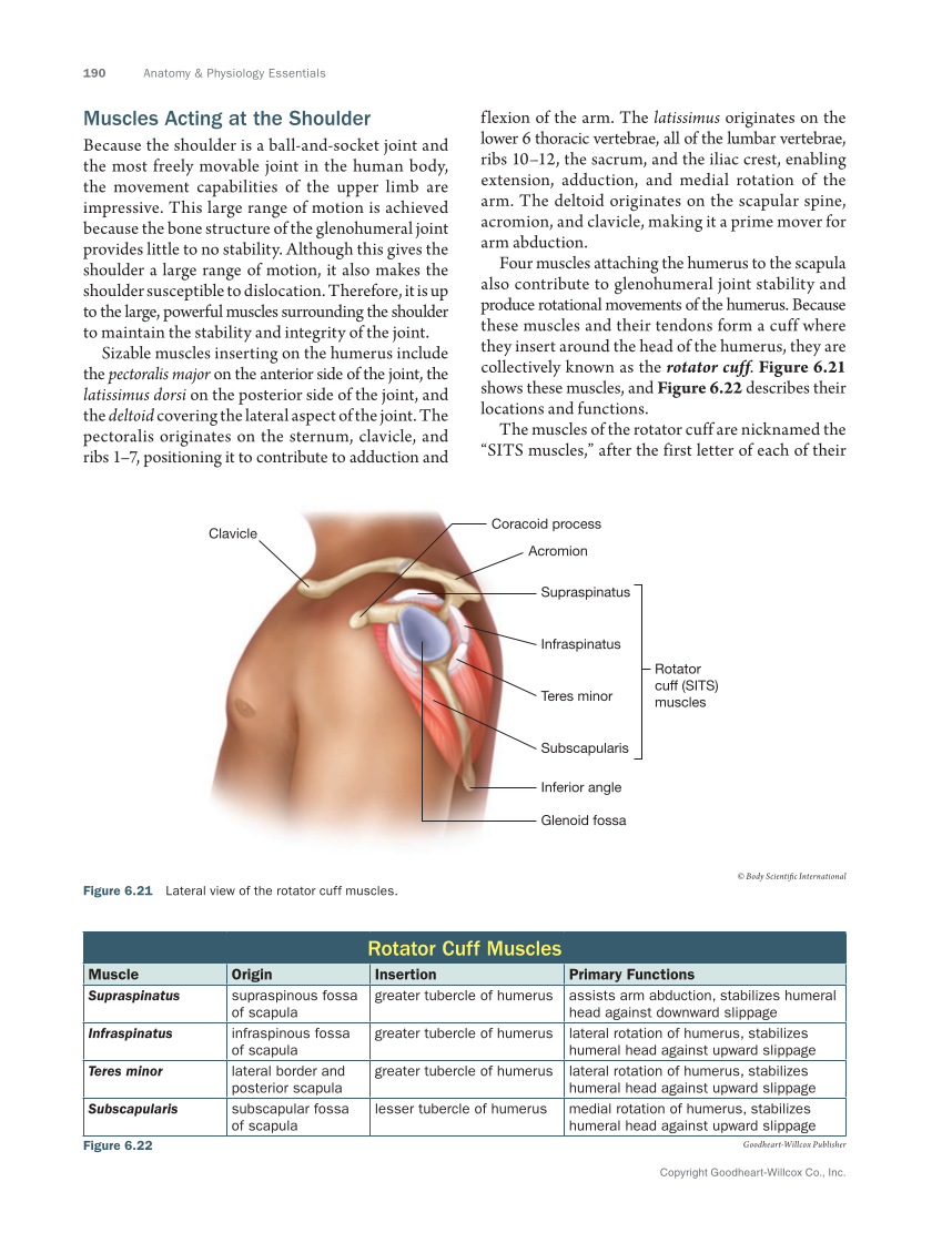 190 Anatomy & Physiology Essentials Copyright Goodheart-Willcox Co., Inc. flexion of the arm. The latissimus originates on the lower 6 thoracic vertebrae, all of the lumbar vertebrae, ribs 10–12, the sacrum, and the iliac crest, enabling extension, adduction, and medial rotation of the arm. The deltoid originates on the scapular spine, acromion, and clavicle, making it a prime mover for arm abduction. Four muscles attaching the humerus to the scapula also contribute to glenohumeral joint stability and produce rotational movements of the humerus. Because these muscles and their tendons form a cuff where they insert around the head of the humerus, they are collectively known as the rotator cuff. Figure 6.21 shows these muscles, and Figure 6.22 describes their locations and functions. The muscles of the rotator cuff are nicknamed the “SITS muscles,” after the first letter of each of their Muscles Acting at the Shoulder Because the shoulder is a ball-and-socket joint and the most freely movable joint in the human body, the movement capabilities of the upper limb are impressive. This large range of motion is achieved because the bone structure of the glenohumeral joint provides little to no stability. Although this gives the shoulder a large range of motion, it also makes the shoulder susceptible to dislocation. Therefore, it is up to the large, powerful muscles surrounding the shoulder to maintain the stability and integrity of the joint. Sizable muscles inserting on the humerus include the pectoralis major on the anterior side of the joint, the latissimus dorsi on the posterior side of the joint, and the deltoid covering the lateral aspect of the joint. The pectoralis originates on the sternum, clavicle, and ribs 1–7, positioning it to contribute to adduction and Supraspinatus Rotator cuff (SITS) muscles Infraspinatus Teres minor Subscapularis Acromion Coracoid process Glenoid fossa Inferior angle Clavicle © Body Scientific International Figure 6.21 Lateral view of the rotator cuff muscles. Rotator Cuff Muscles Muscle Origin Insertion Primary Functions Supraspinatus supraspinous fossa of scapula greater tubercle of humerus assists arm abduction, stabilizes humeral head against downward slippage Infraspinatus infraspinous fossa of scapula greater tubercle of humerus lateral rotation of humerus, stabilizes humeral head against upward slippage Teres minor lateral border and posterior scapula greater tubercle of humerus lateral rotation of humerus, stabilizes humeral head against upward slippage Subscapularis subscapular fossa of scapula lesser tubercle of humerus medial rotation of humerus, stabilizes humeral head against upward slippage Figure 6.22 Goodheart-Willcox Publisher