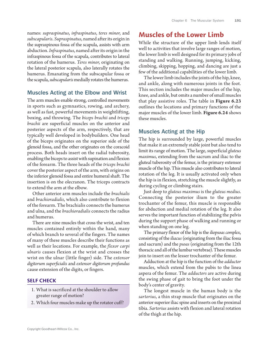 Chapter 6 The Muscular System 191 Copyright Goodheart-Willcox Co., Inc. Muscles of the Lower Limb While the structure of the upper limb lends itself well to activities that involve large ranges of motion, the lower limb is well designed for its primary jobs of standing and walking. Running, jumping, kicking, climbing, skipping, hopping, and dancing are just a few of the additional capabilities of the lower limb. The lower limb includes the joints of the hip, knee, and ankle, along with numerous joints in the foot. This section includes the major muscles of the hip, knee, and ankle, but omits a number of small muscles that play assistive roles. The table in Figure 6.23 outlines the locations and primary functions of the major muscles of the lower limb. Figure 6.24 shows these muscles. Muscles Acting at the Hip The hip is surrounded by large, powerful muscles that make it an extremely stable joint but also tend to limit its range of motion. The large, superficial gluteus maximus, extending from the sacrum and iliac to the gluteal tuberosity of the femur, is the primary extensor muscle of the hip. This muscle also contributes to lateral rotation of the leg. It is usually activated only when the hip is in flexion, stretching the muscle slightly, as during cycling or climbing stairs. Just deep to gluteus maximus is the gluteus medius. Connecting the posterior ilium to the greater trochanter of the femur, this muscle is responsible for abduction and medial rotation of the leg. It also serves the important function of stabilizing the pelvis during the support phase of walking and running or when standing on one leg. The primary flexor of the hip is the iliopsoas complex, consisting of the iliacus (originating from the iliac fossa and sacrum) and the psoas (originating from the 12th thoracic and all of the lumbar vertebrae). These muscles join to insert on the lesser trochanter of the femur. Adduction at the hip is the function of the adductor muscles, which extend from the pubis to the linea aspera of the femur. The adductors are active during the swing phase of gait to bring the foot under the body’s center of gravity. The longest muscle in the human body is the sartorius, a thin strap muscle that originates on the anterior superior iliac spine and inserts on the proximal tibia. Sartorius assists with flexion and lateral rotation of the thigh at the hip. names: supraspinatus, infraspinatus, teres minor, and subscapularis. Supraspinatus, named after its origin in the supraspinous fossa of the scapula, assists with arm abduction. Infraspinatus, named after its origin in the infraspinous fossa of the scapula, contributes to lateral rotation of the humerus. Teres minor, originating on the lateral posterior scapula, also laterally rotates the humerus. Emanating from the subscapular fossa or the scapula, subscapularis medially rotates the humerus. Muscles Acting at the Elbow and Wrist The arm muscles enable strong, controlled movements in sports such as gymnastics, rowing, and archery, as well as fast, powerful movements in weightlifting, boxing, and throwing. The biceps brachii and triceps brachii are superficial muscles on the anterior and posterior aspects of the arm, respectively, that are typically well developed in bodybuilders. One head of the biceps originates on the superior side of the glenoid fossa, and the other originates on the coracoid process. Both heads insert on the radial tuberosity, enabling the biceps to assist with supination and flexion of the forearm. The three heads of the triceps brachii cover the posterior aspect of the arm, with origins on the inferior glenoid fossa and entire humeral shaft. The insertion is on the olecranon. The triceps contracts to extend the arm at the elbow. Other anterior arm muscles include the brachialis and brachioradialis, which also contribute to flexion of the forearm. The brachialis connects the humerus and ulna, and the brachioradialis connects the radius and humerus. There are nine muscles that cross the wrist, and ten muscles contained entirely within the hand, many of which branch to several of the fingers. The names of many of these muscles describe their functions as well as their locations. For example, the flexor carpi ulnaris causes flexion at the wrist and crosses the wrist on the ulnar (little finger) side. The extensor digitorum superficialis and extensor digitorum profundus cause extension of the digits, or fingers. SELF CHECK 1. What is sacrificed at the shoulder to allow greater range of motion? 2. Which four muscles make up the rotator cuff?