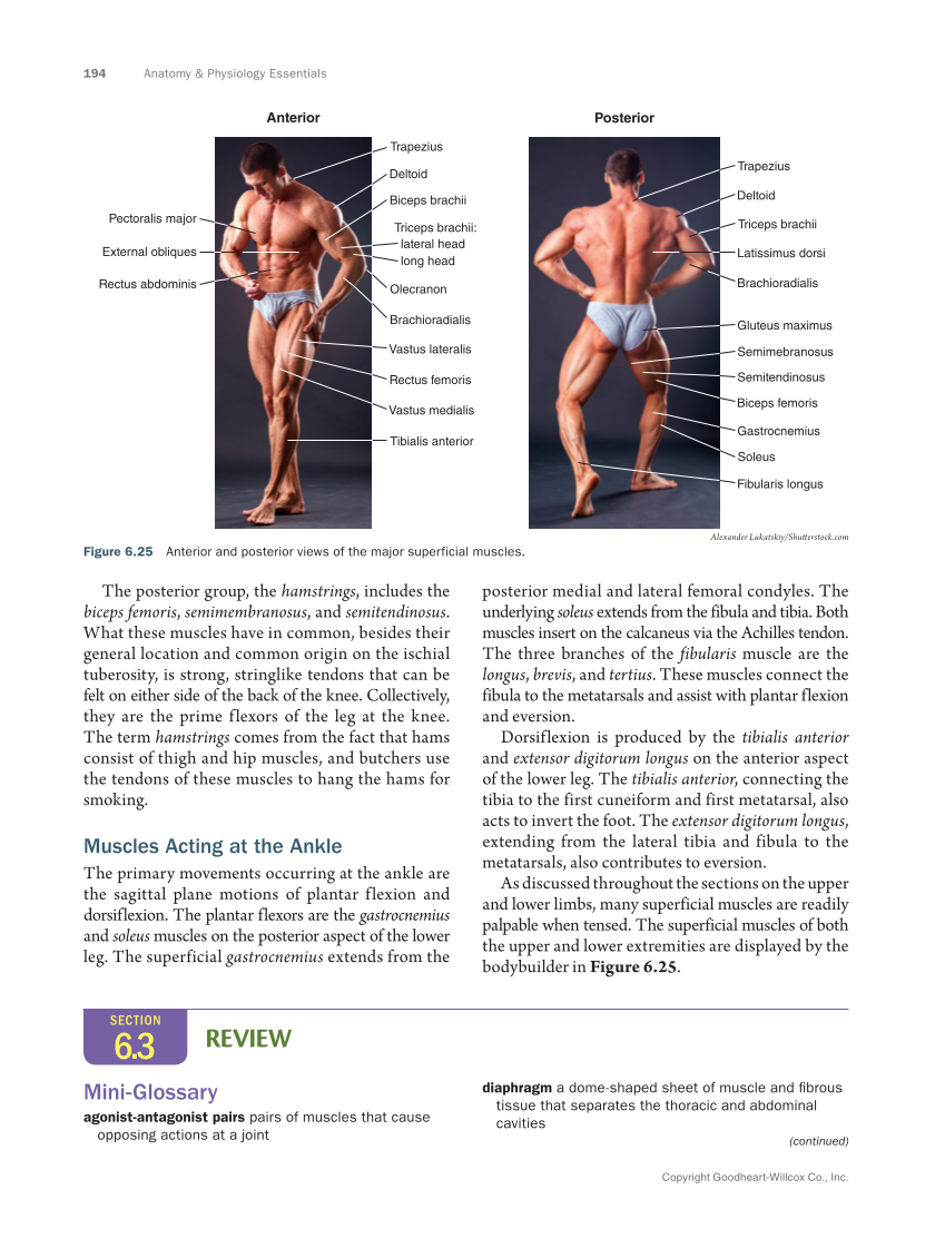 194 Anatomy & Physiology Essentials Copyright Goodheart-Willcox Co., Inc. posterior medial and lateral femoral condyles. The underlying soleus extends from the fibula and tibia. Both muscles insert on the calcaneus via the Achilles tendon. The three branches of the fibularis muscle are the longus, brevis, and tertius. These muscles connect the fibula to the metatarsals and assist with plantar flexion and eversion. Dorsiflexion is produced by the tibialis anterior and extensor digitorum longus on the anterior aspect of the lower leg. The tibialis anterior, connecting the tibia to the first cuneiform and first metatarsal, also acts to invert the foot. The extensor digitorum longus, extending from the lateral tibia and fibula to the metatarsals, also contributes to eversion. As discussed throughout the sections on the upper and lower limbs, many superficial muscles are readily palpable when tensed. The superficial muscles of both the upper and lower extremities are displayed by the bodybuilder in Figure 6.25. The posterior group, the hamstrings, includes the biceps femoris, semimembranosus, and semitendinosus. What these muscles have in common, besides their general location and common origin on the ischial tuberosity, is strong, stringlike tendons that can be felt on either side of the back of the knee. Collectively, they are the prime flexors of the leg at the knee. The term hamstrings comes from the fact that hams consist of thigh and hip muscles, and butchers use the tendons of these muscles to hang the hams for smoking. Muscles Acting at the Ankle The primary movements occurring at the ankle are the sagittal plane motions of plantar flexion and dorsiflexion. The plantar flexors are the gastrocnemius and soleus muscles on the posterior aspect of the lower leg. The superficial gastrocnemius extends from the External obliques Rectus abdominis Trapezius Deltoid Anterior Posterior Pectoralis major Deltoid Biceps brachii Triceps brachii: lateral head long head Olecranon Brachioradialis Vastus lateralis Rectus femoris Vastus medialis Tibialis anterior Trapezius Triceps brachii Latissimus dorsi Brachioradialis Gluteus maximus Semimebranosus Semitendinosus Biceps femoris Gastrocnemius Soleus Fibularis longus Alexander Lukatskiy/Shutterstock.com Figure 6.25 Anterior and posterior views of the major superficial muscles. SECTION 6.3 REVIEW Mini-Glossary agonist-antagonist pairs pairs of muscles that cause opposing actions at a joint diaphragm a dome-shaped sheet of muscle and fibrous tissue that separates the thoracic and abdominal cavities (continued)
