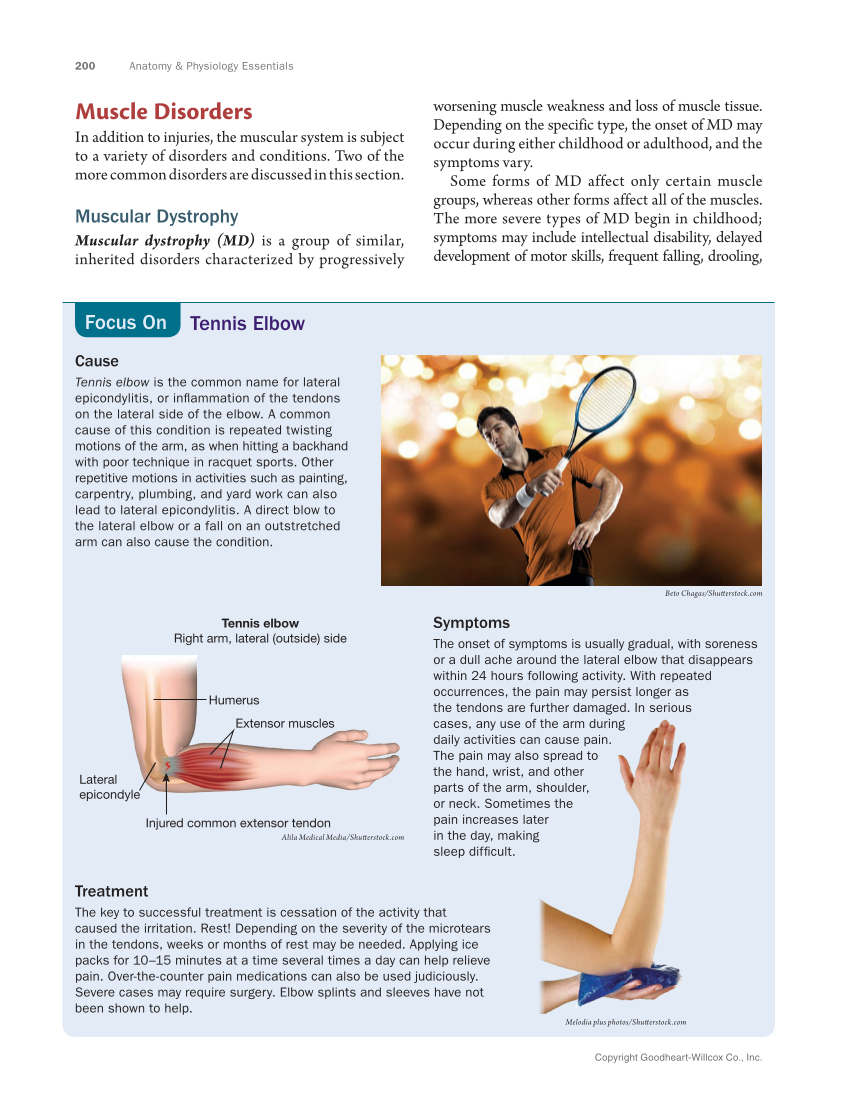 200 Anatomy & Physiology Essentials Copyright Goodheart-Willcox Co., Inc. worsening muscle weakness and loss of muscle tissue. Depending on the specific type, the onset of MD may occur during either childhood or adulthood, and the symptoms vary. Some forms of MD affect only certain muscle groups, whereas other forms affect all of the muscles. The more severe types of MD begin in childhood symptoms may include intellectual disability, delayed development of motor skills, frequent falling, drooling, Muscle Disorders In addition to injuries, the muscular system is subject to a variety of disorders and conditions. Two of the more common disorders are discussed in this section. Muscular Dystrophy Muscular dystrophy (MD) is a group of similar, inherited disorders characterized by progressively Tennis Elbow Focus On Extensor muscles Humerus Lateral epicondyle Injured common extensor tendon Tennis elbow Right arm, lateral (outside) side Alila Medical Media/Shutterstock.com Beto Chagas/Shutterstock.com Cause Tennis elbow is the common name for lateral epicondylitis, or inflammation of the tendons on the lateral side of the elbow. A common cause of this condition is repeated twisting motions of the arm, as when hitting a backhand with poor technique in racquet sports. Other repetitive motions in activities such as painting, carpentry, plumbing, and yard work can also lead to lateral epicondylitis. A direct blow to the lateral elbow or a fall on an outstretched arm can also cause the condition. Melodia plus photos/Shutterstock.com Treatment The key to successful treatment is cessation of the activity that caused the irritation. Rest! Depending on the severity of the microtears in the tendons, weeks or months of rest may be needed. Applying ice packs for 10–15 minutes at a time several times a day can help relieve pain. Over-the-counter pain medications can also be used judiciously. Severe cases may require surgery. Elbow splints and sleeves have not been shown to help. Symptoms The onset of symptoms is usually gradual, with soreness or a dull ache around the lateral elbow that disappears within 24 hours following activity. With repeated occurrences, the pain may persist longer as the tendons are further damaged. In serious cases, any use of the arm during daily activities can cause pain. The pain may also spread to the hand, wrist, and other parts of the arm, shoulder, or neck. Sometimes the pain increases later in the day, making sleep difficult.