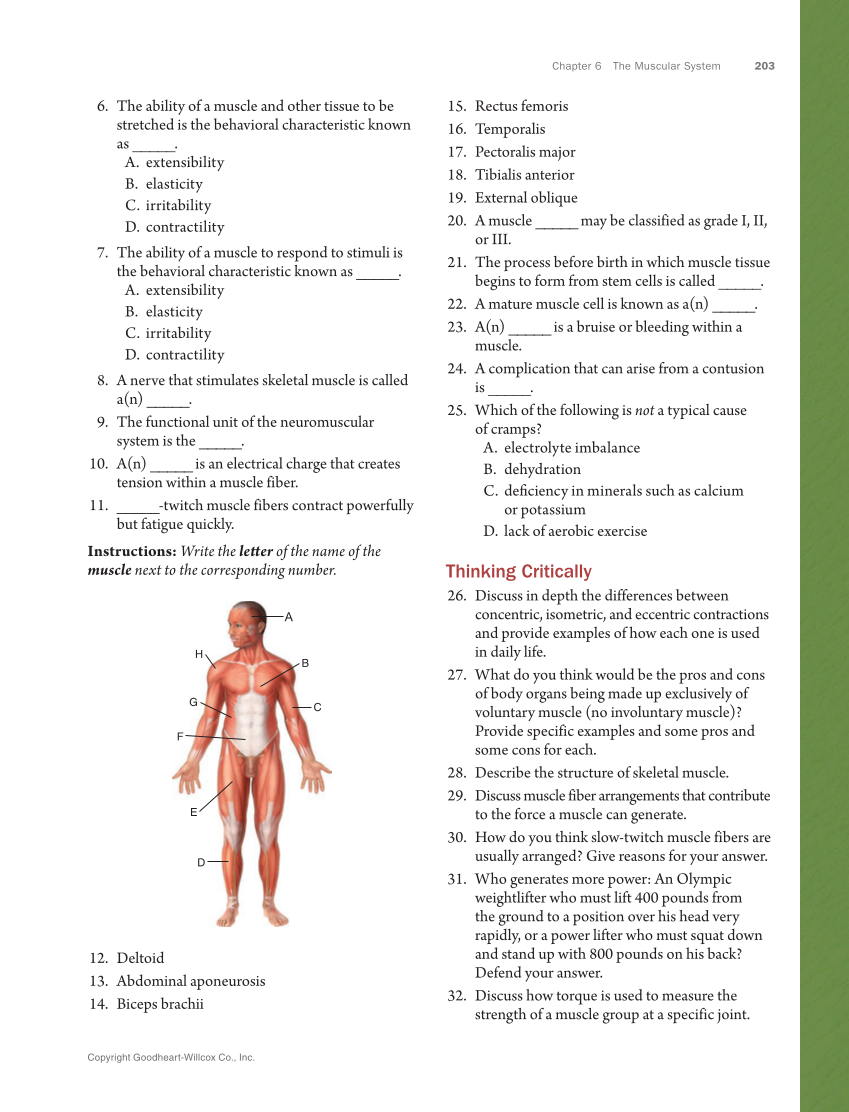 Chapter 6 The Muscular System 203 Copyright Goodheart-Willcox Co., Inc. 15. Rectus femoris 16. Temporalis 17. Pectoralis major 18. Tibialis anterior 19. External oblique 20. A muscle _____ may be classified as grade I, II, or III. 21. The process before birth in which muscle tissue begins to form from stem cells is called _____. 22. A mature muscle cell is known as a(n) _____. 23. A(n) _____ is a bruise or bleeding within a muscle. 24. A complication that can arise from a contusion is _____. 25. Which of the following is not a typical cause of cramps? A. electrolyte imbalance B. dehydration C. deficiency in minerals such as calcium or potassium D. lack of aerobic exercise Thinking Critically 26. Discuss in depth the differences between concentric, isometric, and eccentric contractions and provide examples of how each one is used in daily life. 27. What do you think would be the pros and cons of body organs being made up exclusively of voluntary muscle (no involuntary muscle)? Provide specific examples and some pros and some cons for each. 28. Describe the structure of skeletal muscle. 29. Discuss muscle fiber arrangements that contribute to the force a muscle can generate. 30. How do you think slow-twitch muscle fibers are usually arranged? Give reasons for your answer. 31. Who generates more power: An Olympic weightlifter who must lift 400 pounds from the ground to a position over his head very rapidly, or a power lifter who must squat down and stand up with 800 pounds on his back? Defend your answer. 32. Discuss how torque is used to measure the strength of a muscle group at a specific joint. 6. The ability of a muscle and other tissue to be stretched is the behavioral characteristic known as _____. A. extensibility B. elasticity C. irritability D. contractility 7. The ability of a muscle to respond to stimuli is the behavioral characteristic known as _____. A. extensibility B. elasticity C. irritability D. contractility 8. A nerve that stimulates skeletal muscle is called a(n) _____. 9. The functional unit of the neuromuscular system is the _____. 10. A(n) _____ is an electrical charge that creates tension within a muscle fiber. 11. _____-twitch muscle fibers contract powerfully but fatigue quickly. Instructions: Write the letter of the name of the muscle next to the corresponding number. A H G E F D B C 12. Deltoid 13. Abdominal aponeurosis 14. Biceps brachii