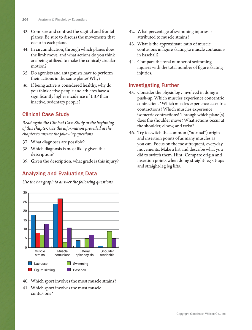 204 Anatomy & Physiology Essentials Copyright Goodheart-Willcox Co., Inc. 42. What percentage of swimming injuries is attributed to muscle strains? 43. What is the approximate ratio of muscle contusions in figure skating to muscle contusions in baseball? 44. Compare the total number of swimming injuries with the total number of figure skating injuries. Investigating Further 45. Consider the physiology involved in doing a push-up. Which muscles experience concentric contractions? Which muscles experience eccentric contractions? Which muscles experience isometric contractions? Through which plane(s) does the shoulder move? What actions occur at the shoulder, elbow, and wrist? 46. Try to switch the common (“normal”) origin and insertion points of as many muscles as you can. Focus on the most frequent, everyday movements. Make a list and describe what you did to switch them. Hint: Compare origin and insertion points when doing straight-leg sit-ups and straight-leg leg lifts. 33. Compare and contrast the sagittal and frontal planes. Be sure to discuss the movements that occur in each plane. 34. In circumduction, through which planes does the limb move, and what actions do you think are being utilized to make the conical/circular motion? 35. Do agonists and antagonists have to perform their actions in the same plane? Why? 36. If being active is considered healthy, why do you think active people and athletes have a significantly higher incidence of LBP than inactive, sedentary people? Clinical Case Study Read again the Clinical Case Study at the beginning of this chapter. Use the information provided in the chapter to answer the following questions. 37. What diagnoses are possible? 38. Which diagnosis is most likely given the description? 39. Given the description, what grade is this injury? Analyzing and Evaluating Data Use the bar graph to answer the following questions. 0 5 10 15 20 25 30 Muscle strains Muscle contusions Lateral epicondylitis Shoulder tendonitis Lacrosse Figure skating Swimming Baseball 40. Which sport involves the most muscle strains? 41. Which sport involves the most muscle contusions?