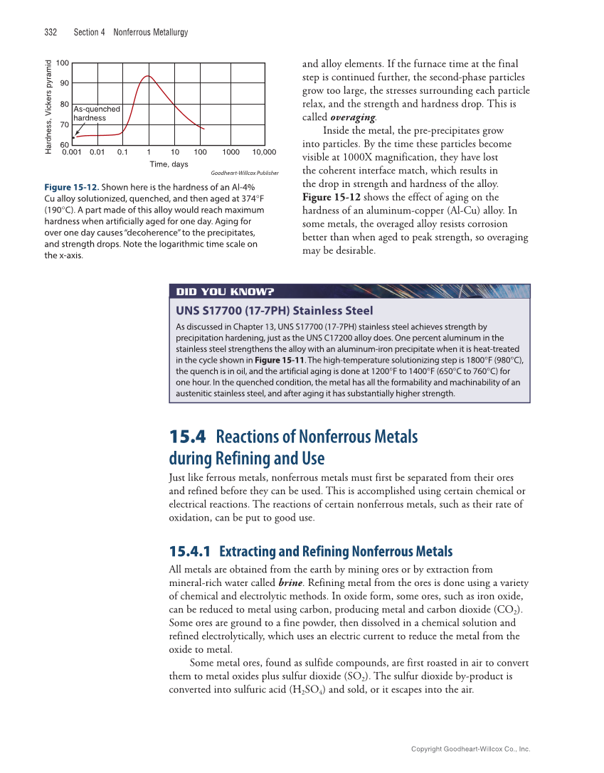 332 Section 4 Nonferrous Metallurgy and alloy elements. If the furnace time at the final step is continued further, the second-phase particles grow too large, the stresses surrounding each particle relax, and the strength and hardness drop. This is called overaging. Inside the metal, the pre-precipitates grow into particles. By the time these particles become visible at 1000X magnification, they have lost the coherent interface match, which results in the drop in strength and hardness of the alloy. Figure 15-12 shows the effect of aging on the hardness of an aluminum-copper (Al-Cu) alloy. In some metals, the overaged alloy resists corrosion better than when aged to peak strength, so overaging may be desirable. UNS S17700 (17-7PH) Stainless Steel As discussed in Chapter 13, UNS S17700 (17-7PH) stainless steel achieves strength by precipitation hardening, just as the UNS C17200 alloy does. One percent aluminum in the stainless steel strengthens the alloy with an aluminum-iron precipitate when it is heat-treated in the cycle shown in Figure 15-11. The high-temperature solutionizing step is 1800°F (980°C), the quench is in oil, and the artificial aging is done at 1200°F to 1400°F (650°C to 760°C) for one hour. In the quenched condition, the metal has all the formability and machinability of an austenitic stainless steel, and after aging it has substantially higher strength. DID YOU KNOW? DID YOU KNOW? 15.4 Reactions of Nonferrous Metals during Refining and Use Just like ferrous metals, nonferrous metals must first be separated from their ores and refined before they can be used. This is accomplished using certain chemical or electrical reactions. The reactions of certain nonferrous metals, such as their rate of oxidation, can be put to good use. 15.4.1 Extracting and Refining Nonferrous Metals All metals are obtained from the earth by mining ores or by extraction from mineral-rich water called brine. Refining metal from the ores is done using a variety of chemical and electrolytic methods. In oxide form, some ores, such as iron oxide, can be reduced to metal using carbon, producing metal and carbon dioxide (CO2). Some ores are ground to a fine powder, then dissolved in a chemical solution and refined electrolytically, which uses an electric current to reduce the metal from the oxide to metal. Some metal ores, found as sulfide compounds, are first roasted in air to convert them to metal oxides plus sulfur dioxide (SO2). The sulfur dioxide by-product is converted into sulfuric acid (H2SO4) and sold, or it escapes into the air. 0.001 100 90 80 70 60 0.01 0.1 10 Time, days Hardness, Vickers pyramid 100 1000 10,000 1 As-quenched hardness Goodheart-Willcox Publisher Figure 15-12. Shown here is the hardness of an Al-4% Cu alloy solutionized, quenched, and then aged at 374°F (190°C). A part made of th is alloy would reach maximum hardness when artificially aged for one day. Aging for over one day causes “decoherence” to the precipitates, and strength drops. Note the logarithmic time scale on the x-axis. Copyright Goodheart-Willcox Co., Inc.