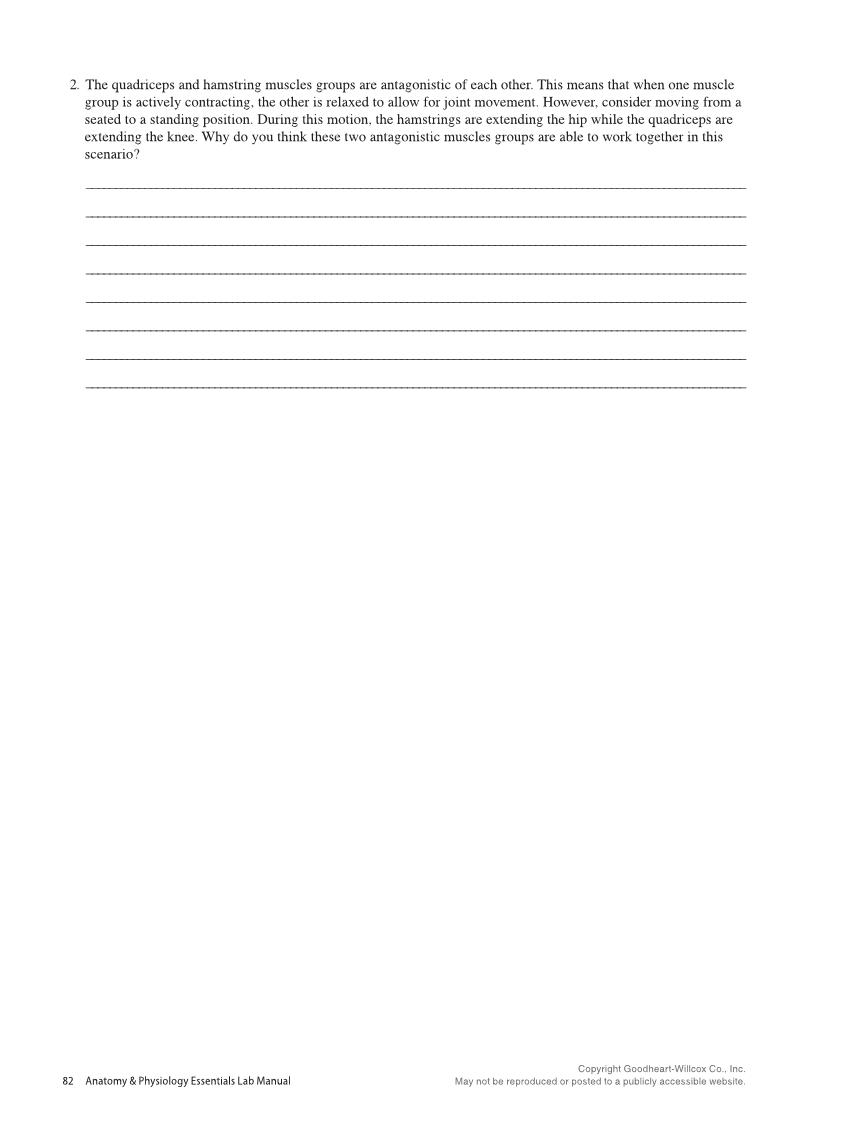 Copyright Goodheart-Willcox Co., Inc. May not be reproduced or posted to a publicly accessible website. 82 Anatomy & Physiology Essentials Lab Manual 2. The quadriceps and hamstring muscles groups are antagonistic of each other. This means that when one muscle group is actively contracting, the other is relaxed to allow for joint movement. However, consider moving from a seated to a standing position. During this motion, the hamstrings are extending the hip while the quadriceps are extending the knee. Why do you think these two antagonistic muscles groups are able to work together in this scenario?_ __________________________________________________________________________________________________________________ __________________________________________________________________________________________________________________ __________________________________________________________________________________________________________________ __________________________________________________________________________________________________________________ __________________________________________________________________________________________________________________ __________________________________________________________________________________________________________________ __________________________________________________________________________________________________________________ _________________________________________________________________________________________________________________